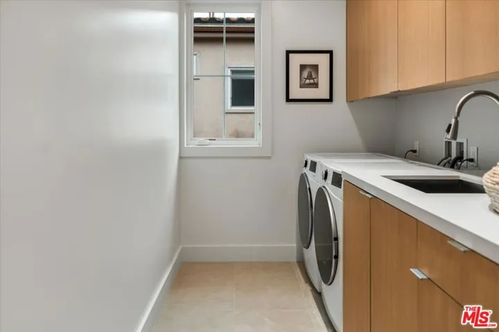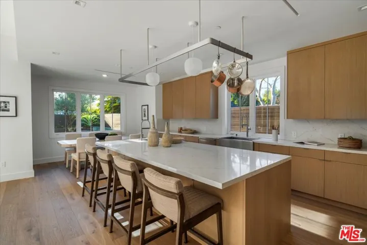 Location matters. Perfectly positioned in the heart of Brentwood, this brand-new 4,064-square-foot residence set on a generous 7,541-square-foot lot defines modern California living: a seamless blend of timeless design, thoughtful functionality, and refined sophistication. The home opens with soaring 11-foot ceilings and expansive French white oak floors that create warmth and openness throughout. The main level features a formal living room, an elegant dining area, and an inviting kitchen and family room that seamlessly connect for effortless entertaining and everyday living. The layout flows beautifully from the dining room connected by a butler’s pantry into a stunning open-concept kitchen and family room. The chef’s kitchen showcases a large Sub-Zero refrigerator with bottom freezer, Wolf appliances, a farm sink, built-in microwave within the island, a prep sink, and space for a second dishwasher. The family room, framed by custom built-in cabinetry, opens through French doors to a covered patio and an expansive, lush backyard a huge grassy retreat perfect for kids to run, play, and enjoy outdoor living. The space is framed by mature landscaping and a stately olive tree, creating a private and serene setting. Also on the main floor is a private office or guest suite with ensuite bath, a dedicated powder room, and a wraparound storage or AV closet beneath the staircase ideal for luggage or seasonal items. Upstairs, a floating loft serves as a versatile hybrid space fully wired for media and ideal as an office, gym, or reading retreat. Three spacious bedrooms include a full laundry room with LG washer/dryer, sink, and custom cabinetry. The primary suite features vaulted ceilings, two walk-in closets (one massive, one generous), and a spa-like bathroom with dual vanities, soaking tub, oversized shower with bench, and sleek built-ins. French doors open to a private stone-covered balcony overlooking mature eucalyptus trees and tranquil treetop vistas. Built with uncompromising attention to quality, the construction is exceptional throughout. Lightweight concrete beneath the French white oak flooring provides superior sound insulation and structural integrity. A four-zone HVAC system ensures personalized comfort, while dual tankless water heaters offer efficiency and convenience. Fire-retardant shingles and concrete siding, all pre-treated for fire resistance, deliver lasting peace of mind. This rare Brentwood opportunity combines privacy, sophistication, and convenience in one of the city’s most desirable neighborhoods. Enjoy the very best of Brentwood living from top-rated schools and tree-lined streets to upscale shops, dining, cafs, and Whole Foods just minutes away. The perfect fusion of design excellence, quality craftsmanship, and lifestyle.