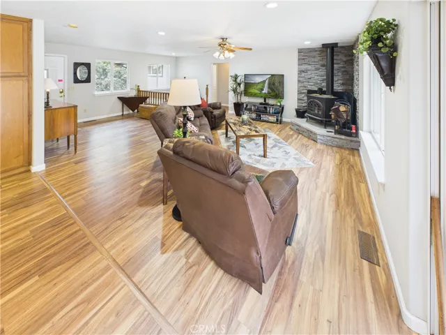 The spacious primary suite is designed for comfort, featuring two full bathrooms connected by a central walk-in closet. The main living area is bright and welcoming, centered around a cozy fireplace—perfect for enjoying the quiet surroundings.