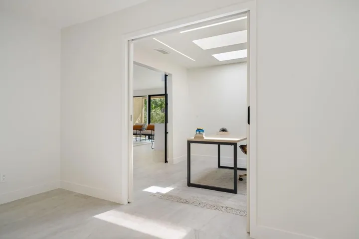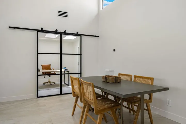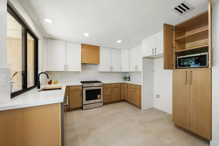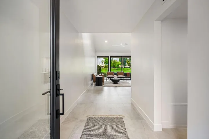View the 3D tour now! Short-term rental/AIRBNB allowed= instant income potential. This fully reimagined home in Monterey Country Club showcases panoramic south-facing MOUNTAIN VIEWS and an organic MODERN DESIGN blending sophistication and desert style. Features include NEW WINDOWS, sliders, solid-core doors, oversized 24×48 designer tiles, & VAULTED ceilings with transom windows flooding the open-concept living area with natural LIGHT.The chef’s kitchen offers custom white oak-style cabinetry, a passthrough bar window for indoor-outdoor entertaining, KitchenAid appliances with rare GAS RANGE, and matching designer hardware. The expanded primary bath features a MARBLE TERRAZZO shower, floating double vanity, and enclosed toilet; the guest bath shines with Zellige tile and fluted wood vanity. A converted atrium with skylights serves as a HOME OFFICE, or 3rd sleeping space.Located on a PRIVATE CORNER of the golf course and greenbelt, this home includes a new tankless water heater, wet bar, sleek lighting, motorized patio awning, and low-maintenance desert courtyard. Enjoy resort-style amenities: clubhouse, fitness center, 27 holes of golf, 13 tennis courts, 20 pickleball courts, bocce, and 37 pools/spas.