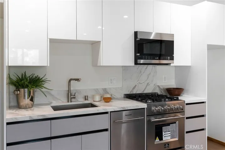 Welcome to this stunning, newly remodeled contemporary residence that beautifully blends timeless Spanish character with modern design and luxury finishes. Step into this fully reimagined 2025 remodel, a gated and private 4-bedroom, 4.5-bath home where every detail reflects high-end craftsmanship and sophisticated style. As you enter the home, you’re immediately greeted by an inviting open-concept floor plan that seamlessly connects the dining area, kitchen, and living room. Natural light floods the space through large windows, highlighting the white oak floors, recessed lighting, skylights, and designer fixtures that bring warmth and modern elegance throughout. The chef’s kitchen is a show-stopping centerpiece, featuring professional-grade appliances, custom cabinetry, and stone-slab countertops designed for dining and entertaining. A dedicated laundry and storage room leads to a versatile basement, perfect for a home office, gym, or creative studio. The adjacent dining area offers an ideal setting for gatherings, while the spacious living room with its statement fireplace provides a cozy focal point for relaxing or entertaining guests.