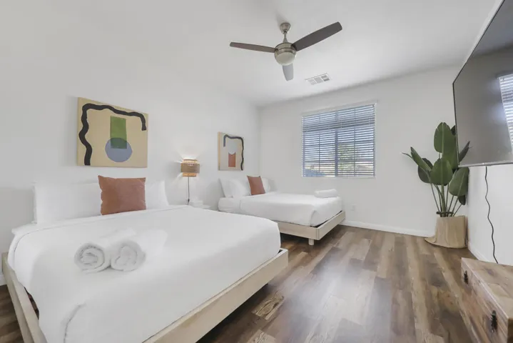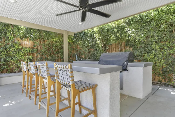 This peaceful desert retreat is designed for connection, comfort, and style. Featuring five bedrooms plus a den, this beautifully remodeled home blends modern simplicity with warm, natural finishes inspired by authentic Spanish design.The third garage bay has been fully permitted and converted into a private casita with its own bath, while the main home retains a two-car garage. The open-concept layout extends effortlessly to a newly designed, professionally landscaped backyard that feels like a private resort.Enjoy a newer automated pool and elevated spa, both easily controlled from your smartphone. The shallow tanning ledge is perfect for lounging or for children to play, while the fire pit area provides a welcoming space to unwind beneath the desert sky.An outdoor kitchen with dual islands sits beneath a pergola equipped with lighting and a ceiling fan. Surrounded by lush ficus, cacti, palms, and olive trees, this serene setting is ideal for intimate gatherings or quiet moments in the sun.