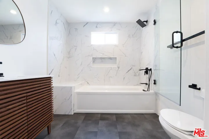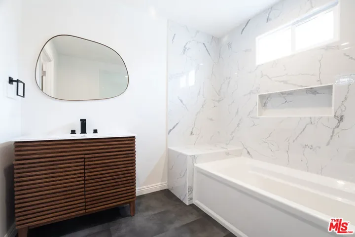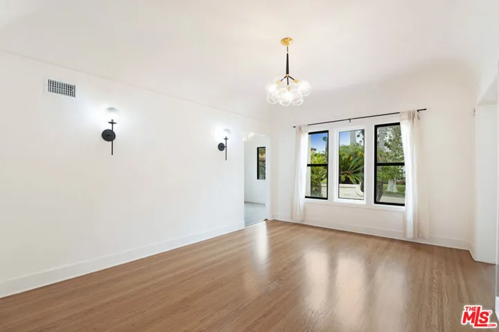 Enhanced Storybook Tudor w front porch, exquisite hardwood floors, new kitchen & bathrooms, 2 car garage, & outdoor living. Open the front door to the expansive living room boasting a barrel ceiling, large frontal windows, tons of natural light, & a fireplace. The formal dining room showcases another impressive window overlooking the front porch & is complemented by a coved ceiling. Through the dining room, enter the brand-new eat-in kitchen w a cathedral ceiling complete w brand-new SS appliances, countertops + cabinets, & a side exit to the driveway. The 3 BDs downstairs are spacious & the 2 bathrooms are newly renovated with a modern touch. The master BD offers an en-suite BA w dual vanity, a beautiful shower, & walk-in closet. BD #2 has sliding glass doors that offer access to the backyard/patio. All lower BD have walk-in closets & the laundry closet is tucked away in the hall w side-by-side WD. The loft upstairs provides extra privacy w another sizable bedroom. Entertain or enjoy family time in the backyard of the property – paved area w a basketball court + 2 car garage, grass yard w patio & pergola. View this property ASAP if you have your eye on the Hancock Park area. Swingset no longer on property.