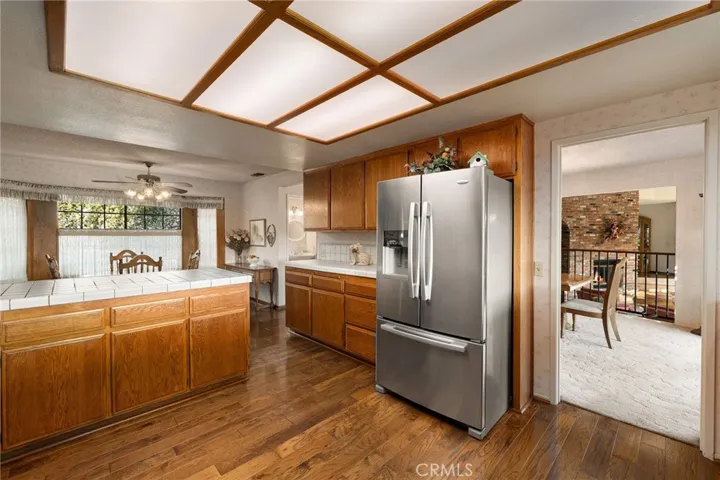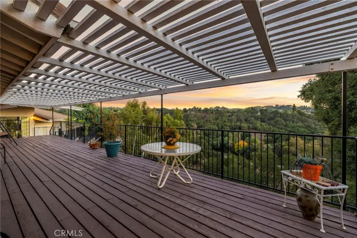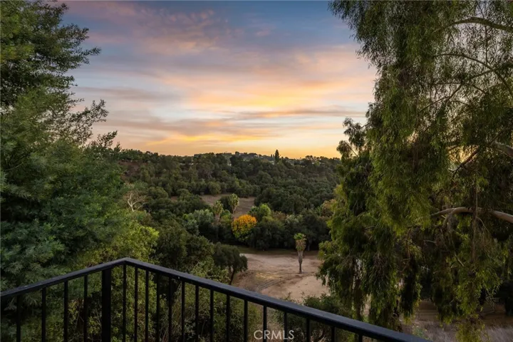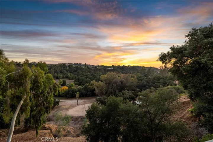 Custom-built home on a prime street with panoramic views and an oversized, horse-zoned lot. Exceptional curb appeal includes a sprawling brick façade, manicured lawn and landscaping, mature trees, and concrete steps to a covered brick porch with a wood-and-glass front door. Inside, hardwood floors lead to a formal dining room and a view-filled living room; the dining room opens through French doors to the back deck and overlooks the living room via an open wrought-iron railing. The living room showcases a full wall of glass framing sweeping vistas, a floor-to-ceiling brick fireplace, and a vaulted ceiling with exposed-beam detail. The spacious kitchen offers solid wood cabinetry, tiled counters and backsplash, stainless steel appliances, a view-facing garden window, and a peninsula with counter seating, while a breakfast nook sits at a bay window overlooking the front yard. A separate family room features a 12-foot sliding door to the deck, more views, a built-in bar, and a vaulted ceiling with an exposed beam. Two convenient half baths serve guests. Down the hall, the primary bedroom includes a ceiling fan, sliding door to the deck and views, a walk-in closet, and an ensuite bath with dual sinks, a tub with tile surround, and a separate glass-enclosed shower. Three additional bedrooms (one with built-ins, currently used as an office) share a full hall bath. An indoor laundry/mudroom with ample cabinetry opens to the backyard and connects to the attached three-car garage. Outside, a deck spans the width of the home to take in unobstructed views of the horse ring below, the canyon, hills, and beyond, while the side yards provide additional space with a rolling lawn and oak trees.