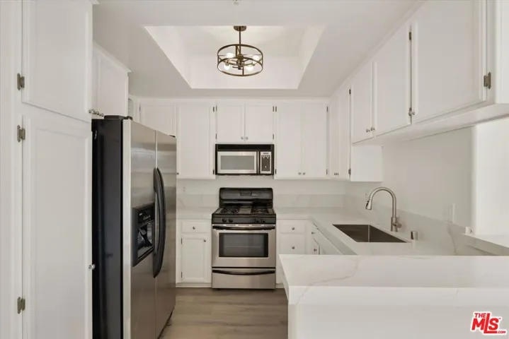 Poised above the city, this top-floor penthouse offers an elegant expression of Westside living. Soaring vaulted ceilings and natural light frame an open, airy layout centered around a warm fireplace and an inviting living space. The chef’s kitchen combines form and function with stainless-steel appliances, generous cabinetry, and seamless connection to the main living area; perfect for effortless entertaining. The primary suite evokes calm sophistication with a spacious walk-in closet and a dual-vanity bath. A second en-suite bedroom provides flexibility for guests or a refined home office. Step outside to a private balcony with sweeping city views, ideal for morning coffee or evening sunsets. Additional features include in-unit laundry, secure building entry, and gated parking. Perfectly positioned near Brentwood, Santa Monica, and the vibrant Sawtelle dining scene, this residence blends contemporary style, everyday comfort, and exceptional convenience in one elevated home. Lease offered at 13 months or more.