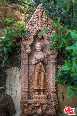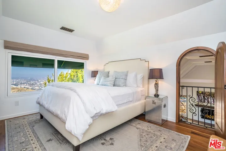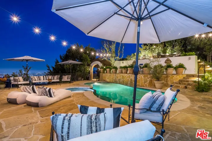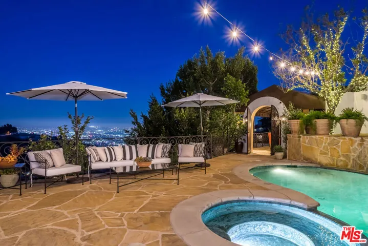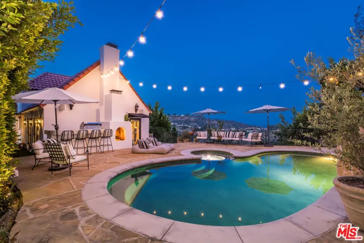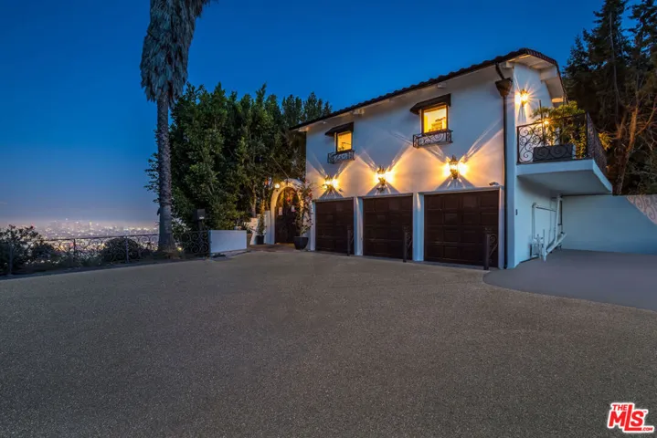 A must-see Hollywood Hills Hideaway | Unmatched Privacy, Safety + Explosive Views. At the very end of a private promontory sits this romantic Mediterranean estate, a rare jewel where timeless elegance meets modern luxury. No expense was spared in creating this fully custom home with Waterworks fixtures, hand selected walnut hardwood floors, artisan tilework, and bespoke cabinetry throughout. For the health conscious, the home is comprised of all natural materials along with a whole house water filter (Aquasana) and a whole house filtered HVAC system (IQ Air). A drinking water filtration system was also installed in the kitchen. The chef’s kitchen features Viking appliances, Liebherr refrigerator seamlessly integrated with the cabinetry for a sleek built-in aesthetic, opening to dramatic indoor-outdoor living spaces perfect for entertaining. Celebrity approved with a state-of-the-art security system and rolling tamper-proof, bullet-resistant shutters, this property offers true peace of mind. The open layout flows to multiple expansive terraces, a sparkling pool, bubbling fountains, fire pit, cabana, and two additional outdoor fireplaces, all framed by sweeping, romantic views of the city. Rare direct access to your three-car garage, Sonos-powered surround sound, and fully connected smart home systems for lighting, cameras, and security all easily controlled from your phone make for easy secure living. Set on a large private lot with endless possibilities, this home isn’t just a place to live, it’s a lifestyle.