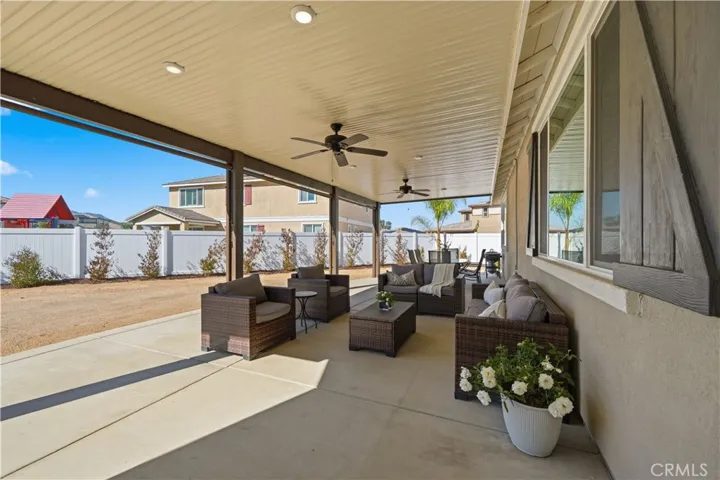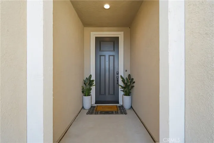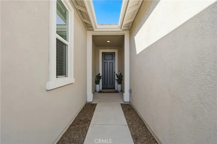 Welcome to this stunning single-story 4-bedroom, 2-bath home with PAID off solar! Offering 2,328 sq. ft. of modern living on a massive 12,632 sq. ft. lot with mountain views — a rare find in Southern California! Built just one year ago, this home is like new and combines open-concept living with exceptional upgrades inside and out. As you walk through the front door you are greeted by an open floor plan featuring a spacious great room, neutral designer tones, and an effortless flow between living, dining, and kitchen spaces. The kitchen showcases granite countertops, a large island, stainless steel appliances, white shaker cabinetry, pendant lighting, a walk-in pantry, and an abundance of counter and storage space — perfect for entertaining or family gatherings. The expansive primary suite offers a relaxing retreat, ample natural light, and a large walk in closet. The primary bathroom features a walk in shower, separate soaking tub, dual sinks, and crisp white cabinetry for a clean, spa-like feel. The three additional bedrooms provide flexibility for a growing family, guests, or a home office. The laundry room includes built-in cabinetry and a utility sink for added convenience. Enjoy Southern California living in the oversized backyard, offering endless possibilities — there’s plenty of space to build your dream pool or your imagination of an outdoor oasis. The 14’ x 31.5’ covered patio features dual ceiling fans, recessed lighting, and an electrical outlet, perfect for year-round entertaining. Take advantage of the shaded built-in playground, added irrigation with drip lines, a sprinkler system ready for grass installation, added retaining wall, and planted palm trees/hedges around the property. Additional features include an epoxied three-car garage with and an oversized driveway! Located in a peaceful neighborhood surrounded by mountain views and newer homes, this property blends comfort, functionality, and modern style — truly a turnkey gem!