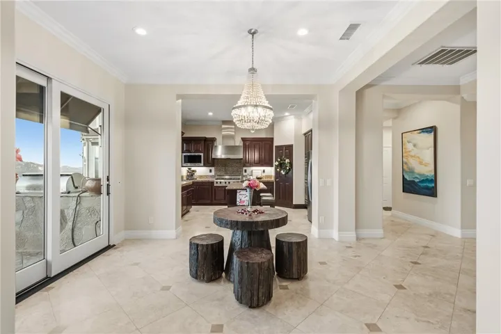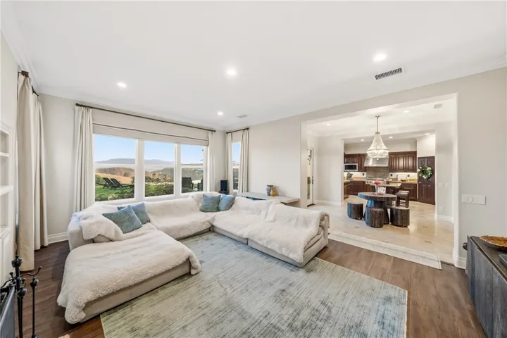 Beyond a private gated entrance lies this exceptional, Single Level, French Country Estate offering 4 Bedrooms, 3.5 Bathrooms, 3844 Sq Ft, (2) 2-Car Garages and a Salt Water Infinity Edge Pool. It’s Located at the end of a cul-de-sac on one of De Luz’s most prestigious streets & set on approx 5.7 Acres of beautifully landscaped grounds, with over 150Ft of towering Italian Cypress. Enter into an elegant foyer illuminated by cascading chandeliers, soaring vaulted ceilings, travertine floors, crown molding, and coved architectural details that set the tone for timeless sophistication. This thoughtfully designed Estate features Formal Living & Dining Rooms, an Executive Office, Gourmet Kitchen, Informal Dining & Family Rooms, all blending classic elegance with modern comfort. The Kitchen is the heart of the home featuring a center island, dark brown triple-milled cabinetry with soft-close drawers, granite countertops, & convenient pull-out shelving. The space is equipped with stainless steel appliances, including a six-burner Viking cooktop, overhead range, double ovens, & a walk-in pantry that offers ample storage for all your culinary essentials. The Kitchen opens to an Informal Dining area and Family Room, ideal for everyday living. The primary suite occupies the south wing of the home, serving as a private retreat complete with a fireplace, direct access outdoors, dual walk-in closets, dual sinks, a vanity, walk-in shower, a private water closet & a luxurious soaking tub with a chandelier above. From every room, expansive windows draw your gaze outward, inviting you to experience the beauty that surrounds this extraordinary estate. Nature becomes part of the home, with panoramic 180° views of the rolling mountains, peaceful valleys, and the shimmering city lights of Temecula below. The infinity-edge Pool appears to spill effortlessly into the horizon, serving as the crown jewel of the outdoor living space, evoking the serenity of a world-class resort. The outdoor bar area has a BBQ, countertop seating and a mini frig for entertaining. In the early mornings, a delicate mist drapes across the valley, creating the ethereal sensation of floating above the clouds. It’s a setting that evokes peace, where guests often describe feeling a deep sense of connection to nature, and to something far greater than themselves.This is more than a home, it’s an experience of serenity, beauty, and timeless elegance in one of De Luz’s most coveted, close to town locations.