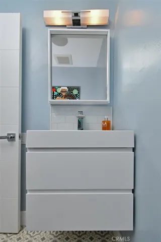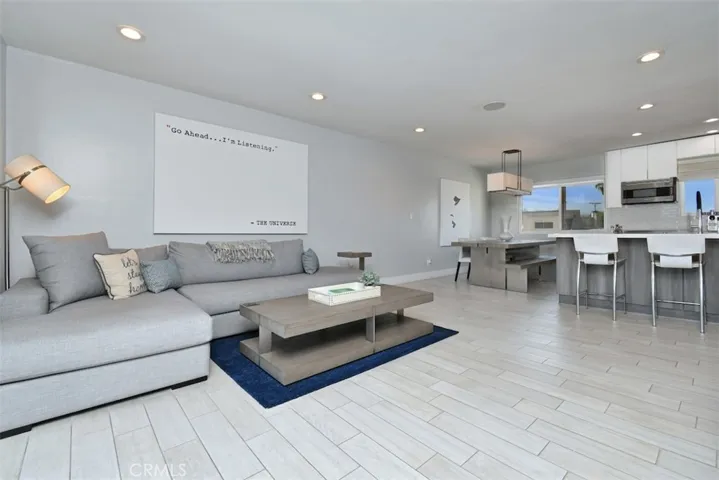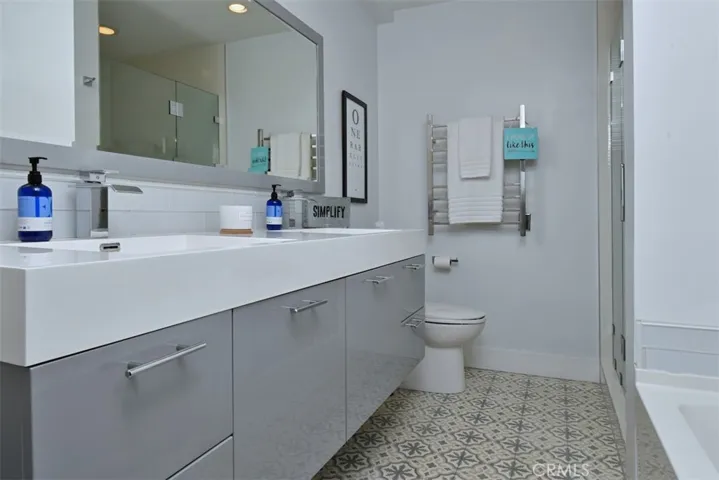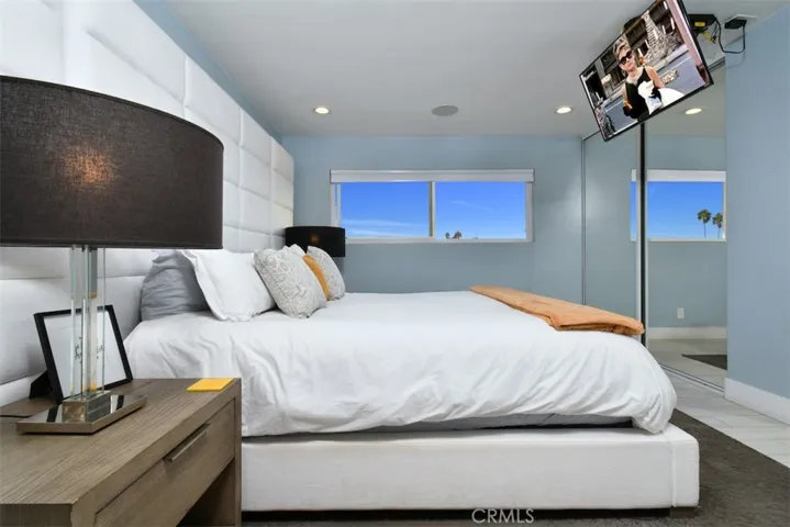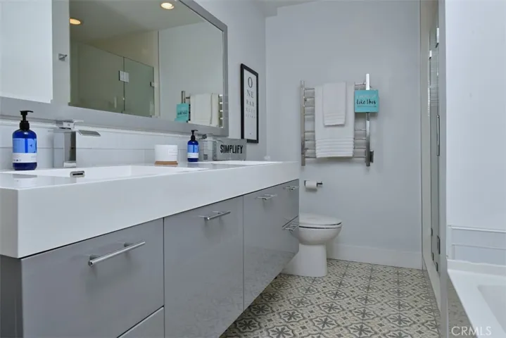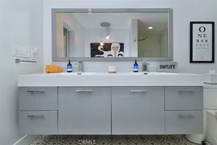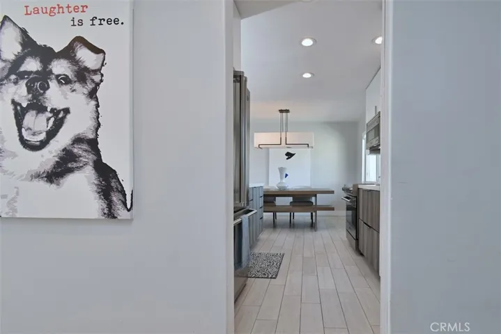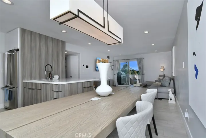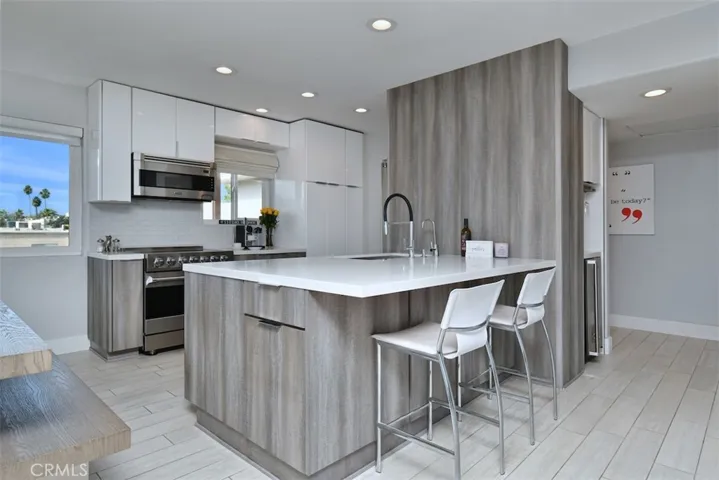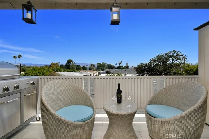 Located in the heart of Sherman Oaks, just one block from Ventura Boulevard, this stunning, modern, top floor condo offers a beautifully upgraded turnkey interior with sweeping views from every window. Tucked away at the back of a small, quiet complex, this smart home spares no expense in design or comfort. Refined with exceptional attention to detail, the open-concept floor plan features a spacious living and dining area adjacent to a chic gourmet kitchen. Highlights include quartz countertops, a glass subway tile backsplash, and premium appliances Viking stove and built-in microwave, Bosch dishwasher, and accent wood paneling. Custom all wood Schuler soft-close cabinetry and a large island with counter seating complete the space. The living room opens to an oversized balcony overlooking the Valley, ideal for relaxing or entertaining. Smart features abound, including recessed lighting on dimmers, a Control4 system with built-in speakers throughout and a Nest thermostat. The designer bathrooms feature imported Mexican concrete tiles, while the primary suite offers a luxurious retreat with dual sinks, a soaking tub beneath a statement light fixture, a heated towel rack, and a spacious walk-in shower. Built-in closets provide ample storage and style. Additional touches include a custom bar with Viking wine fridge, central HVAC, and durable high-end ceramic tile flooring throughout. Perfectly located near Sherman Oaks’ best restaurants, cafés, and boutiques, this sophisticated top-floor condo blends modern luxury with everyday convenience, a truly special place to call home.