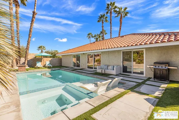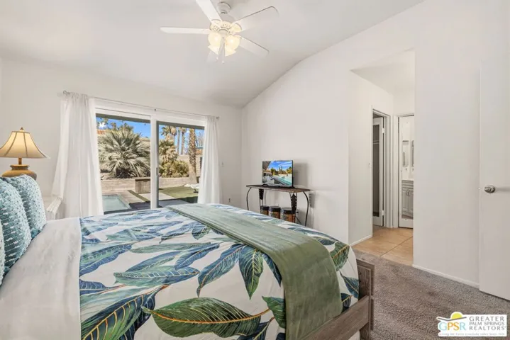 Wow! Bright, stylish, and perfectly positioned for the Palm Springs good life. Poolside mountain views too! This furnished 3 bedroom, 2 bath home celebrates open concept living and resort-style outdoor spaces with sliders from the living, dining, and kitchen areas that open to the saltwater pool, spa, and Baja sunning deck surrounded by mature palms. Vaulted ceilings and clerestory windows fill the interiors with light. Set on Fee Land, you own the land, with underground utilities so no overhead wires interrupt the views. The ensuite primary suite offers direct pool access and a generous walk-in closet, while guest bedrooms share a full bath with clerestory window. Double pane windows and sliders add to the appeal. Two-car garage and utility room just off the kitchen. Waterwise landscaping keeps upkeep simple. Located in Quail Point, a community of 83 homes in Vista Norte with no HOA and not gated. Currently eligible for Short Term Rental permits from the city. Take the Matterport Virtual Tour for a better sense of flow.