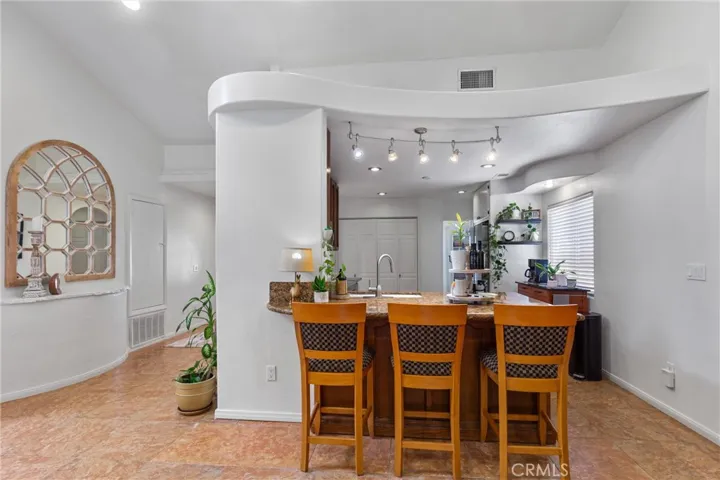 Inside, soaring vaulted ceilings and a skylight fill the open-concept living spaces with natural light, creating an airy, spacious ambiance throughout. The primary bedroom and living area flow seamlessly to the pool and patio through French doors, ideal for effortless entertaining. The kitchen offers granite countertops and ample storage, while a versatile bonus room with dual French doors opening to the front patio serves perfectly as an office, art studio, or breakfast nook.