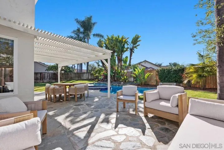 PRICE IMPROVEMENT! Located in the heart of La Costa, just a few minutes from beaches, golf courses, and top-ranked schools, this beautifully updated home is set at the end of a quiet cul-de-sac. Offering the ideal blend of style and comfort, the thoughtfully designed floor plan features a spacious open-concept kitchen and family room with fireplace, formal living and dining areas, and a coveted downstairs bedroom with a full bath. Natural oak wood flooring complements the light-filled interiors, while the remodeled baths showcase designer finishes, custom vanities, Silestone quartz countertops, and high-end fixtures. Framed by sliding glass doors, the large backyard is perfect for entertaining or play, complete with sparkling free-form pool and spa, expansive grassy areas, and outdoor shower. A dedicated laundry room adds everyday convenience, while the finished garage—with newer epoxy floors, built-in cabinetry, and updated lighting—complete this move-in ready home that perfectly balances function, warmth, and California living.