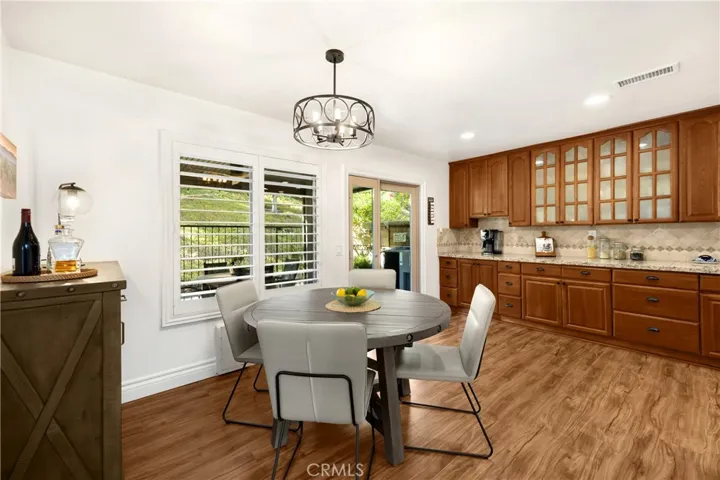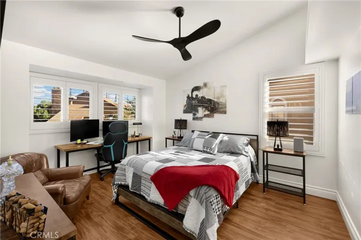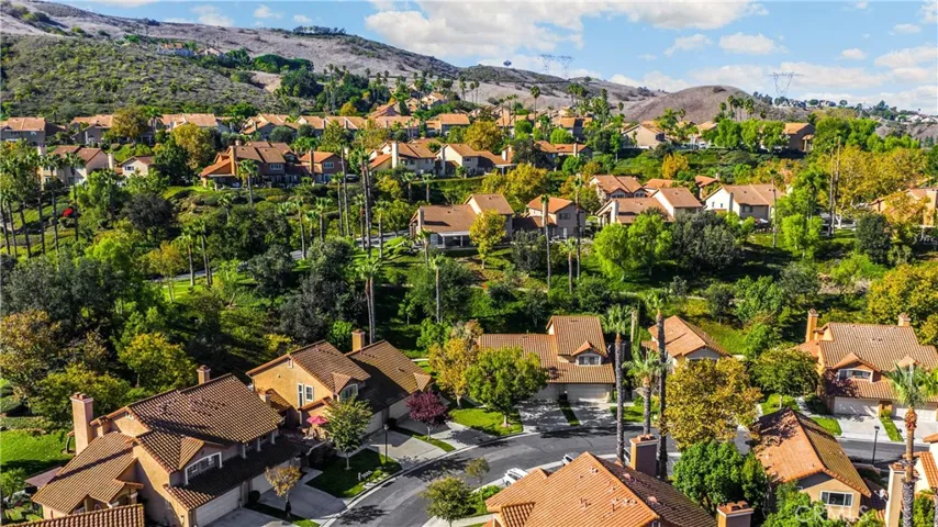 Beautifully updated home in the Anaheim Hills, tucked on a peaceful cul-de-sac in the desirable Camino Grande Villas community. Arrive to a professionally landscaped courtyard and gated, brick-lined patio, with an upgraded entry door setting the stage for the completely turnkey interior. Inside, the bright and airy home showcases upgraded luxury plank flooring, modern baseboards, and plantation shutters throughout that invite the perfect amount of natural light. The living room features dramatic cathedral ceilings, a gas fireplace, and a shiplap feature wall, with views of the pergola-shaded patio. The remodeled kitchen offers a spacious eat-in dining area with direct backyard access through an upgraded back door. Home chefs will love the upgraded KitchenAid appliances, granite countertops, and ample storage in custom wood cabinetry with pull-out drawers. Effortlessly move outside to grill and relax on the covered patio, which includes a BBQ-ready gas line, ceiling fan, and side walls for privacy. The lower level is complete with a refreshed powder room and laundry facilities in the two-car attached garage, which features a Tesla charger and additional driveway parking. Upstairs, retreat to two generously sized primary suites, each designed for comfort and privacy with tall vaulted ceilings, ceiling fans, walk-in closets with custom organizers, and two remodeled en suite full bathrooms. A spacious linen closet is conveniently placed on the upper landing. This home is truly move-in ready, with extensive recent updates including a new AC and heating system with an attic fan (2023), a whole-house water softener, and updated windows, doors, sprinkler system, garage built-ins, washer/dryer, water heater, fans, lighting, and fixtures throughout. This prime Anaheim Hills location is close to the Anaheim Hills Golf Course, schools, shopping, dining, and great hiking trails all nearby. With easy freeway access and a host of thoughtful upgrades, this meticulously maintained property is ready to welcome you home.