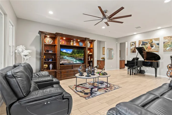 The chef’s kitchen serves as the heart of this home, featuring expansive granite countertops, custom backsplash, and premium cabinetry with designer pulls. High-end appliances are enhanced by thoughtful details like under-cabinet lighting, pull-out shelving, and custom pendant fixtures, while a walk-in pantry provides abundant storage.