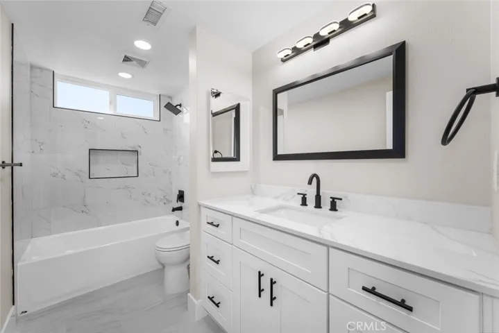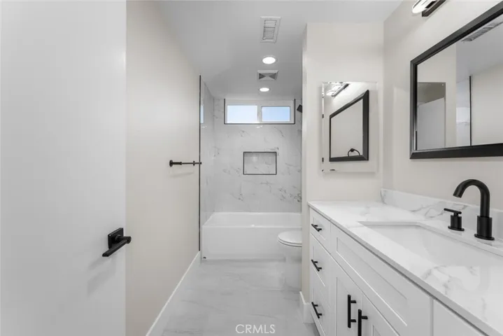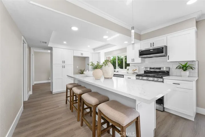 Located in the sought-after “Hollandia Tract,” homeowners will benefit from a pristine and turn-key condition new home. Curb appeal welcomes you with new exterior paint, landscaping, and a beautiful distinctive front door. As you enter, the spacious living room presents a freshly painted neutral color palette that awaits your personal touch. The home boasts numerous upgrades dual-pane windows, stunning vinyl laminate floors throughout with tile in the bathrooms, a remodeled kitchen with quartz countertops, subway-tile backsplash, new appliances and an extensive center island. Convenient downstairs bedroom for guests, extended family, or a home office is available. The remodeled downstairs bath includes a shower as well. Upstairs includes the spacious primary bedroom with dual closets and private bathroom, three additional bedrooms, and a full hallway bathroom. All bathrooms are remodeled in the current desired style and flows with the remainder of the house. Toulouse is conveniently located and provides access to many of the conveniences of Southern California, schools, parks, amusement parks, entertainment, and transportation.