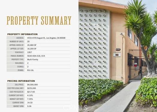 Rare opportunity to acquire a well-positioned 20-unit apartment complex located in one of Los Angeles’ most rapidly developing neighborhoods. 4723 & 4725 August Street feature two 10-unit low-rise buildings totaling approximately 20,680 sq. ft. on a ±0.38-acre lot. Each building offers a desirable mix of studio-, one-, two-, and three-bedroom units, all separately metered for utilities. Property amenities include gated access, on-site parking, and fully equipped kitchens and heating in every unit. These features support strong tenant retention and stable income. Ideally situated just south of Coliseum Street, the property offers exceptional proximity to Baldwin Hills Crenshaw Plaza, Kenneth Hahn State Recreation Area, and the Destination Crenshaw corridor—a major public and private investment celebrating art, history, and culture. Residents enjoy convenient access to the I-10 and I-105 freeways, the Expo/Crenshaw Metro Line, and LAX, providing easy connectivity throughout Los Angeles. With ongoing neighborhood revitalization, cultural vibrancy, and community pride, Baldwin Hills / Crenshaw stands as one of the city’s most promising multifamily submarkets. Whether for long-term hold or value-add repositioning, 4723 & 4725 August Street presents a compelling opportunity to invest in the growth and transformation of this dynamic area.