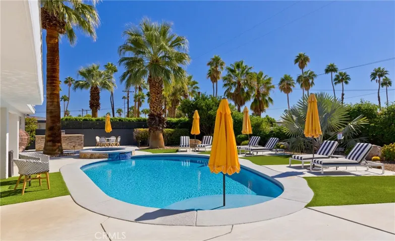 Monthly and/or Short Term Rental. Welcome to The Movie Colony Escape, a rare 4-bedroom, 4-bathroom Mid-Century Modern home in one of Palm Springs’ most iconic neighborhoods — The Movie Colony is where Hollywood legends such as Frank Sinatra, Elizabeth Taylor, Marilyn Monroe, Cary Grant, Dinah Shore, Dean Martin once escaped the studio lights and found their paradise beneath the desert sun. This gem offers resort-style outdoor living and timeless Hollywood charm. Your sunny sanctuary all year long. This rare Mid-Century Modern residence spans over 2,100 square feet of living space on a nearly 11,000 square foot lot. Light, bright, and private, designed for effortless desert living, the home features clean mid-century lines, open spaces, and glass doors that invite the outdoors in. Each bedroom has its own bath, providing comfort and privacy for families or groups traveling together. Outside, a resort-style backyard awaits — complete with a sparkling pool, cozy fire-pit, lounge chairs, and outdoor dining area framed by swaying palm trees and panoramic mountain views. Ideal for snowbirds, seasonal travelers, short-term vacation stays. Only 5 minutes from Downtown Palm Springs shopping, world renowned dining, nightlife. Close to Palm Springs Art Museum & Uptown Design District, Convention Center. Minutes from world-class golf, spas, and hiking trails. 10 minutes from Palm Springs International Airport.
