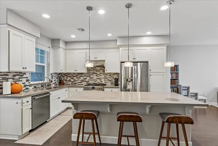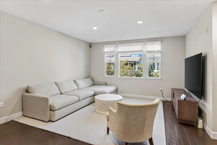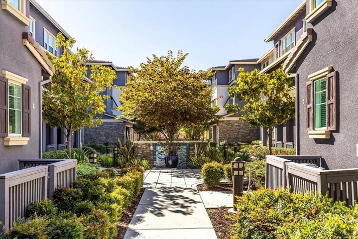 Nestled in the sought-after Sandalwood community, this beautiful townhome is designed with comfort and elegance in mind. The heart of the home is the expansive Great Room, featuring a spacious kitchen centrally positioned between a formal dining area and a generous living space. Dining area seamlessly connects to a covered balcony, ideal for enjoying outdoor meals or relaxing. The modern kitchen is a true social hub, equipped with a large island that provides versatility for casual dining and effortless entertaining. Premium finishes include granite countertops, mosaic tile backsplash, sleek stainless-steel appliances and ample cabinetry for all your storage needs. Upstairs, the primary suite offers a luxurious sanctuary with a spacious shower, dual-sink vanity, private water closet, and an expansive walk-in closet complete with organizers to maximize space and functionality. The ground-level suite provides flexibility and convenience, making it perfect for a home office or guest accommodation. Premium features include tile floors in all bathrooms, zoned HVAC for personalized climate control, upper-level laundry, custom window treatments. Community amenities include playground and clubhouse. Unbeatable location just moments from Downtown Sunnyvale, Caltrain, and major tech hubs.
