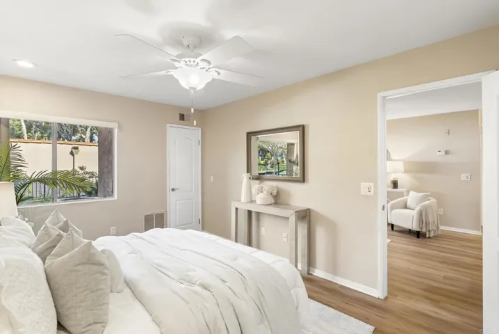 Welcome to Lucera in the heart of University City! Don’t miss this private corner unit featuring a rare dual primary suite layout, each with its own ensuite bathroom. Ideally situated on opposite sides of the open concept living area. The inviting living room showcases abundant natural light, and access to an oversized patio, perfect for relaxing. The modern kitchen features sleek countertops, stainless steel appliances, new plank flooring in the living room, dining room and bedrooms, rustic paver-style flooring in kitchen and bathrooms, plenty of storage, with in-unit laundry and assigned parking garage for added convenience. Thoughtfully maintained, this home offers true privacy within a gated community. Lucera residents enjoy premium amenities including a clubhouse, pool, spa, gym, walking trails, tennis and basketball courts, plus direct access to Nobel Recreation Park and the nearby library. Centrally located near UTC, UCSD, Miramar, and the 5 and 15 freeways, this home places you close to everything while offering the tranquility of a private retreat.
