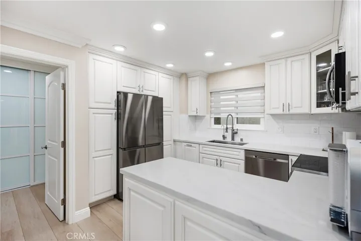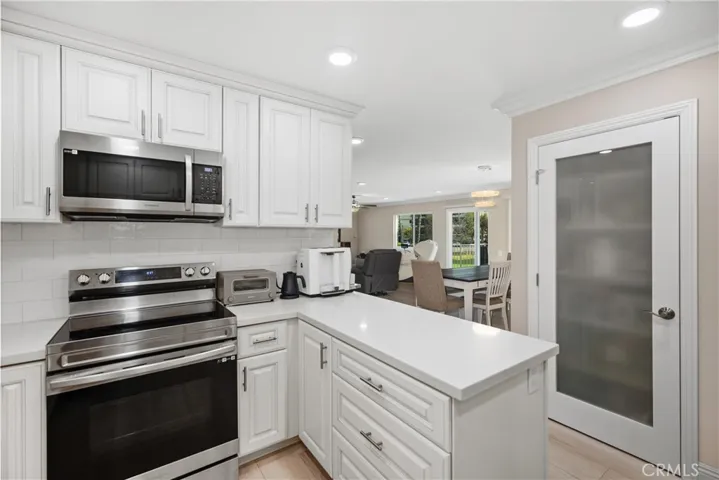 YOU WILL NOT WANT TO MISS THIS BEAUTIFULLY REMODELED “GARDEN VILLA” MODEL IN EVERY WAY POSSIBLE OVERLOOKING THE GOLF COURSE! Spacious 2-bed, 2-bath with elevator access and prime fairway views. The open-concept great room showcases walls of dual-pane windows, a sleek slab-surround electric fireplace, crown molding, recessed LED lighting, and wide-plank luxury vinyl floors throughout. Cleverly tucked behind the electric fireplace is a large storage room perfect for luggage, holiday bins, hobbies, and bulk supplies. Two large sliders lead to an expansive covered balcony finished with tile, ideal for entertaining, morning coffee, and taking in the sweeping golf panorama. The chef’s kitchen stands out with white soft-close cabinetry, quartz countertops, a subway tile backsplash, stainless steel appliances, a deep single-bowl sink with a pull-down faucet, abundant storage, including a frosted-glass pantry door, and a serving peninsula for casual meals and entertaining. The living room separates the two spacious bedrooms for excellent privacy. The serene primary suite features a whole wall of frosted-panel closets, a ceiling fan, and a luxuriously remodeled bath with a quartz vanity, a framed LED mirror, and a tub and shower with designer large-format tile and a glass enclosure. The guest bedroom is generously sized for visitors or a home office, and the adjacent guest bath features a quartz-top vanity, a framed LED mirror, and a beautiful walk-in shower with a niche and a grab bar. Additional upgrades include crown molding throughout, modern interior doors and hardware, energy-efficient ductless mini-split heating and cooling, contemporary roller shades, and dual-pane windows for comfort and quiet.