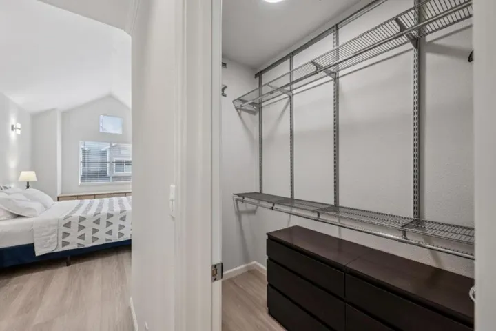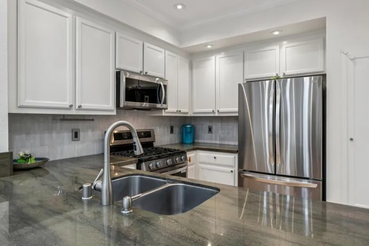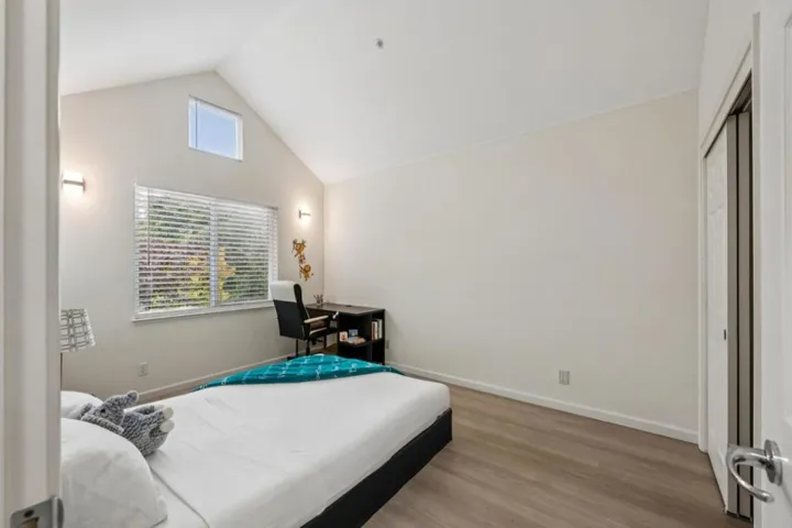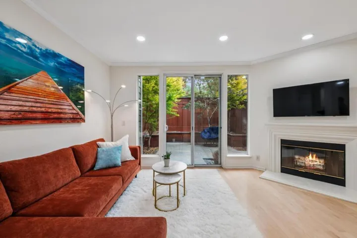 Move-in ready. This stylish 2-story home offers a bright open floor plan with elegant living and dining areas featuring bamboo floors, high ceilings, crown moldings, recessed lighting, and a cozy fireplace. The updated kitchen shines with granite counters, stainless steel appliances, a breakfast bar, and abundant cabinetry. Private patio with mature maples is perfect for relaxing or entertaining. Two spacious en-suite bedrooms upstairs with vaulted ceilings and skylights, including a primary suite with a walk-in closet and dual-sink vanity. Laundry room, dual-pane windows, 1-car attached garage + assigned parking. Beautifully maintained Pacific Parc grounds close to downtown Menlo Park, Palo Alto, Caltrain, Meta, parks, and Willow Oaks Park access.