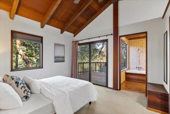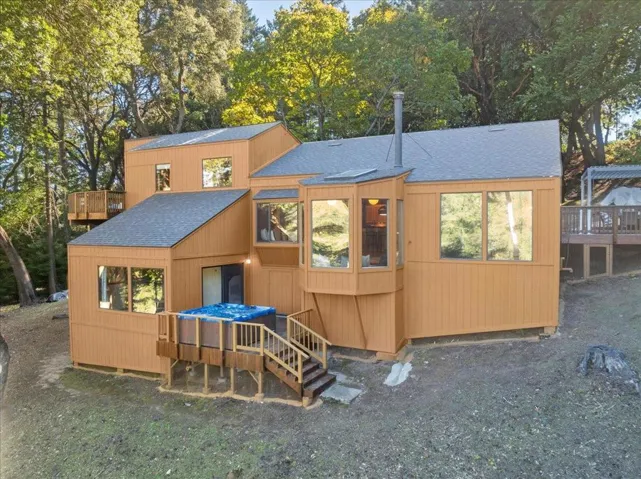 Escape to tranquility in this stunning home nestled in the forest of the sought-after Las Cumbres community. Dappled in natural light through soaring skylights and surrounded by nature, this unique home offers a seamless blend of rustic charm and modern comfort. Step inside to discover vaulted ceilings, and an open-concept layout with multiple lofts, designed for relaxation and entertaining. The kitchen features a bay window breakfast bar, perfect for morning coffee, and flows effortlessly into the dining room and dramatic wraparound glass entertaining nook invites the outdoors in, showcasing spectacular cross-canyon views. Enjoy the ultimate in outdoor living with numerous decks, ideal for gatherings, stargazing, or soaking in the hot tub under the forest canopy. A detached garage with loft and workshop provides ample space for hobbies or a creative studio. On the grounds, you’ll even find an ancient Indian grinding stone, connecting this serene setting to the regions rich history where light, space, and serenity come together in perfect harmony. Las Cumbres community residents enjoy a vibrant lifestyle with tennis and basketball courts, a sports field, swimming pool, bocce ball, community BBQ area, and playground. High-speed internet, award-winning Los Gatos High School.