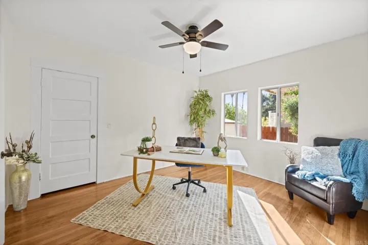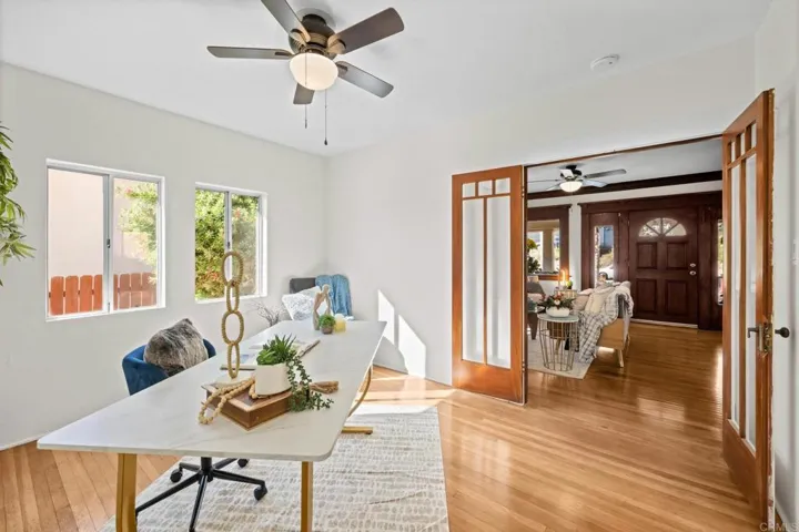 Charming Craftsman home that has been freshly renovated while preserving its original character. Bright and airy throughout, this home showcases beautiful original wood accents, including crown molding, built-ins, and detailed door and window frames. The original wood floors add warmth and authenticity to every room. The large, open kitchen features two-toned cabinets, a custom backsplash, and all new stainless steel appliances. A spacious dining room is perfect for gatherings, and the updated bathroom includes dual sinks. The laundry room offers additional storage, and the home sits peacefully on a quiet cul-de-sac. The backyard’s natural elevation presents an ideal opportunity to create a deck or viewing area to take in the surrounding views. Mature palm trees in the front complete the curb appeal of this tastefully updated home that perfectly blends classic charm with modern comfort.