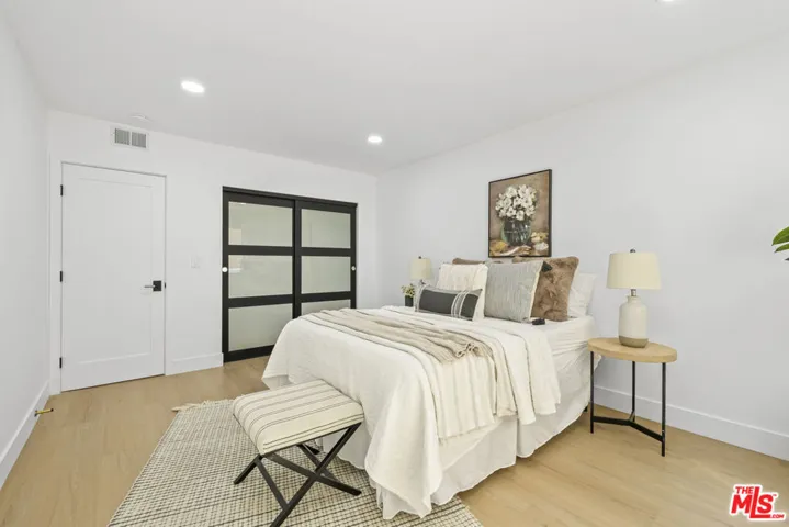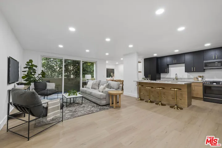 Step into this brand-new designer remodel a 2 bed, 2 bath corner unit offering exceptional privacy, modern luxury, and elevated comfort. The open-concept floor plan flows effortlessly from the living room to the dining area and into a show piece kitchen. Outfitted with Cafe appliances, Taj Mahal quartz countertops, sleek black cabinetry, warm wood accents, and a large island with seating, the kitchen is both stylish and functional perfect for entertaining. Expansive new Milgard Tuscany white windows and sliding glass doors flood the space with natural light and connect to a private balcony surrounded by greenery. Wide-plank French White Oak floors run throughout, creating a seamless modern aesthetic. The bathrooms have been fully reimagined with Taj Mahal quartz counters, custom wood vanities, large-format tiled floors, and brushed gold fixtures. The primary suite includes dual vanities and a walk-in shower, blending luxury with everyday convenience. This home also offers in-unit laundry hookups, with a shared laundry room in the garage for oversized items. Community amenities include a beautifully maintained lobby, sparkling pool, visitor parking, and rentable storage bins in two garage storage areas. Two gated garage parking spaces complete this home. Located on tree-lined Kings Road, just steps to Santa Monica Blvd and the Sunset Strip, this residence delivers timeless design and prime West Hollywood living.