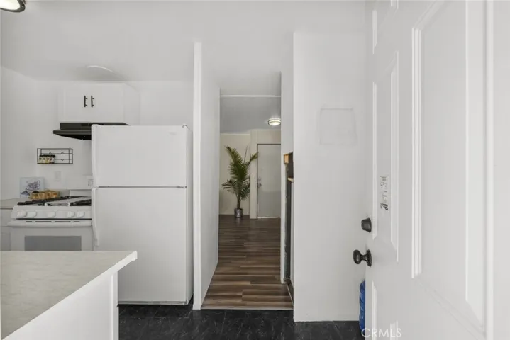 The kitchen comes equipped with warm wood cabinetry, a stove, refrigerator, and a convenient indoor laundry area for added convenience. The primary bedroom is generously sized and includes a walk-in closet, while the secondary bedroom also offers ample space. The full bathroom features tiled flooring, wood cabinets.