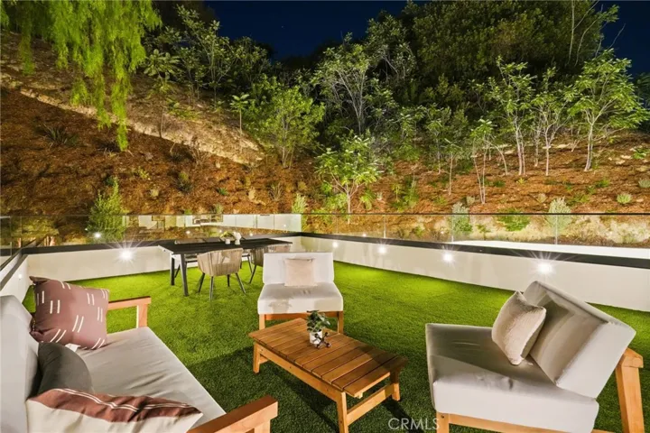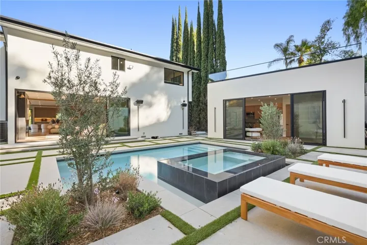 Outside, your own private paradise awaits: a sparkling pool and spa with cascading waterfall, mature olive trees, outdoor fireplace, and a fully equipped BBQ island with bar seating. Multiple lounging zones and a spacious side yard provide endless backdrops for content creation or sunset entertaining. A detached guest house/ADU doubles as the perfect studio, gym, or creative suite.