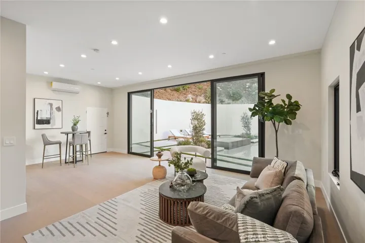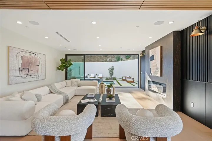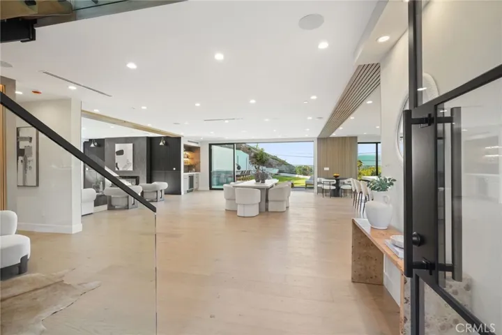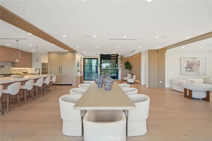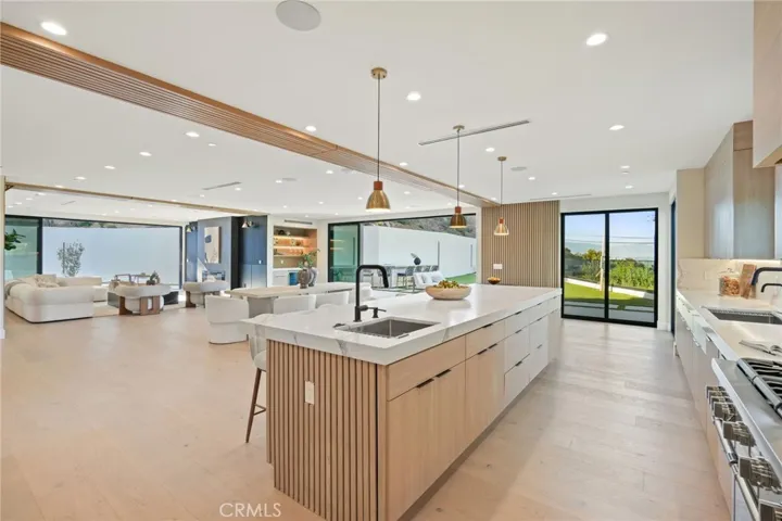 A grand open-concept living room with soaring ceilings, floor-to-ceiling glass walls, and seamless indoor-outdoor transitions creates an immediate “wow” factor. The custom chef’s kitchen—outfitted with a waterfall island, built-in espresso bar, and designer appliances—flows naturally into the living and dining spaces, making it ideal for filming, hosting, and family gatherings.