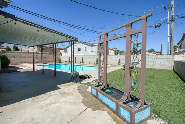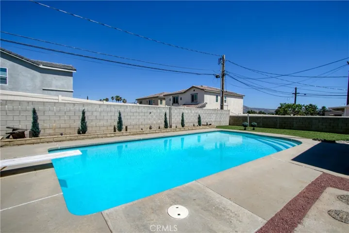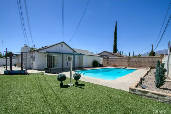Beautiful POOL Home with 3 bedrooms, 2 bathrooms. Bathrooms have been gorgeously updated. Primary bedroom has modern chic zebra shade blinds and large closet. The en-suite primary bathroom has been updated with modern mirror with built-in LED light and extra features. Shower is also modern and luxurious. 2nd bedroom with wood-look laminate flooring. 3rd bedroom with carpet. Guest bathroom in hallway has been updated with jetted bathtub and sparkling light fixture. Living room has statement fireplace and glass slider door access to the backyard with covered patio and a large refreshing POOL! Dining room has tile flooring. Kitchen has a great view of the pool in the backyard as well and access to the garage. 2-car garage and a LONG LONG driveway! Side yard features a wide gate for anyone who is looking for additional space with access. The covered patio is a great shaded area for outdoor recreation. Pool is an amazing backyard oasis! Perfect enjoying the warm California weather! Fridge and dishwasher stay with the home. Washer and dryer hookups in garage.