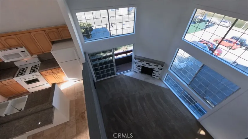 The open-concept living area includes a cozy fireplace and an elevated dining area or flex space overlooking the great room. The kitchen offers generous counter space and cabinetry, with bar seating and a view into the living room—ideal for entertaining. Downstairs, both bedrooms feature ensuite baths and mirrored closets, providing comfort and privacy for residents or guests. Enjoy four private balconies that extend the living space outdoors, offering fresh air and a true coastal lifestyle.