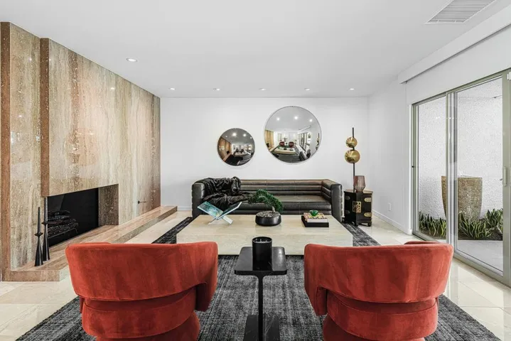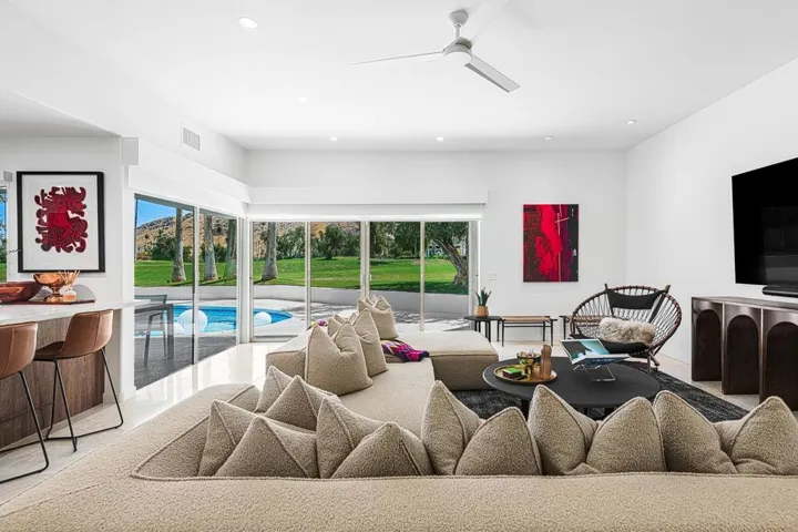 Set against the dramatic backdrop of the Santa Rosa Mountains, this striking white modern residence offers serene golf course vistas and an atmosphere of tranquility within a beautifully maintained community.From the moment you arrive, the home’s captivating curb appeal and lush, sculpted landscaping create an unforgettable first impression. Iconic double entry doors open to an interior that masterfully blends sleek modern design with effortless livability. The inviting living room, anchored by a travertine fireplace, sets the stage for elegant entertaining or quiet evenings by the fire.The formal dining room frames picture-perfect views of the mountains, golf course, pool, and spa an exquisite setting for dinner parties and gatherings. Adjacent, the chef’s kitchen is a culinary dream, appointed with premium appliances, a center prep island, quartz countertops, and a casual dining bar ideal for morning coffee or relaxed meals. Flowing seamlessly from the kitchen, the spacious family room offers the perfect retreat after sun-drenched days spent lounging by the pool or soaking in the spa amidst the resort-style backyard.Perfectly situated near world-class dining, shopping, golf, and hiking, this residence places you at the very heart of the Palm Springs lifestyle. After a day of exploration, unwind in the luxurious primary suite where every detail has been thoughtfully curated for comfort and style. Two beautifully appointed guest rooms ensure your visitors feel equally at home.An attached garage adds everyday convenience, completing this impeccable desert retreat a harmonious blend of luxury, sophistication, and ease. Once here, you may never want to leave.