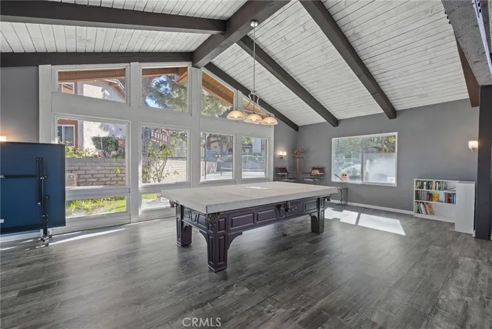 Step inside to discover a spacious living room with beautiful beamed and vaulted ceilings, complemented by an open-concept layout that welcomes abundant natural light through large windows framing serene views of mature courtyard trees. The modern kitchen features quartz countertops, stainless steel appliances, a breakfast bar, and ample storage. The dining area flows seamlessly into the living space, creating an airy and inviting atmosphere.