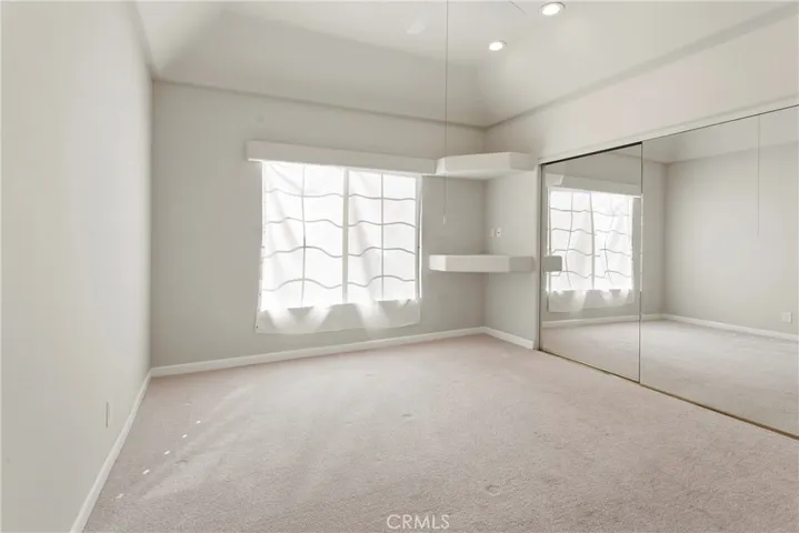 This beautifully maintained Del Prado townhome offers the perfect blend of comfort, style, and convenience. Located on an upper carriage end unit, you’ll enjoy peace and privacy with no one above or below. The corner location with expansive windows fill the home with natural sunlight throughout the day. Step inside to an elegant open-concept floor plan with soaring vaulted ceilings. The spacious living area features a cozy fireplace and opens to a private balcony overlooking the neighborhood—perfect for relaxing or entertaining. The kitchen offers ample cabinet space along with a newer microwave and dishwasher. The generous bedroom includes a closet with built-in organizers, while the bathroom boasts a dual sink vanity. Additional highlights include recessed lighting, inside full-size laundry, and an attached direct-access one-car garage.