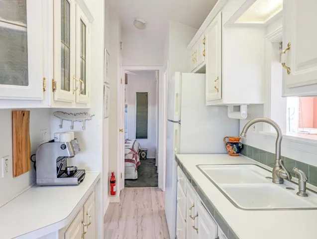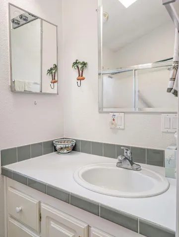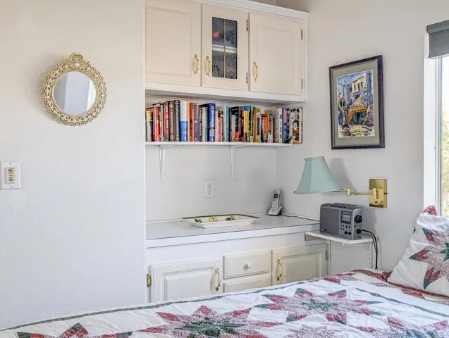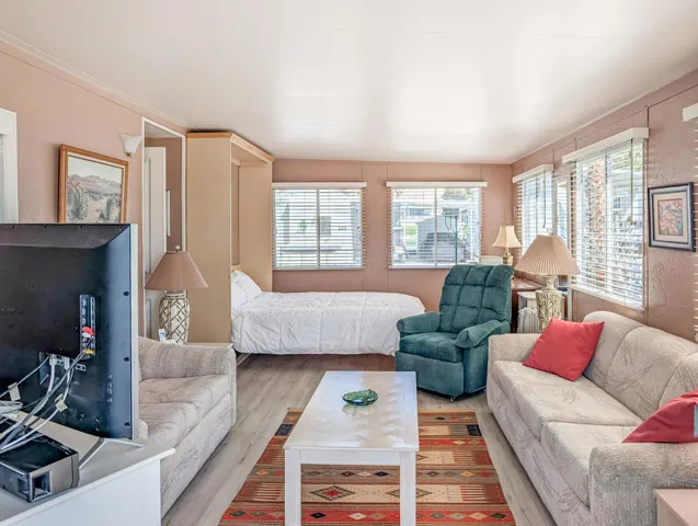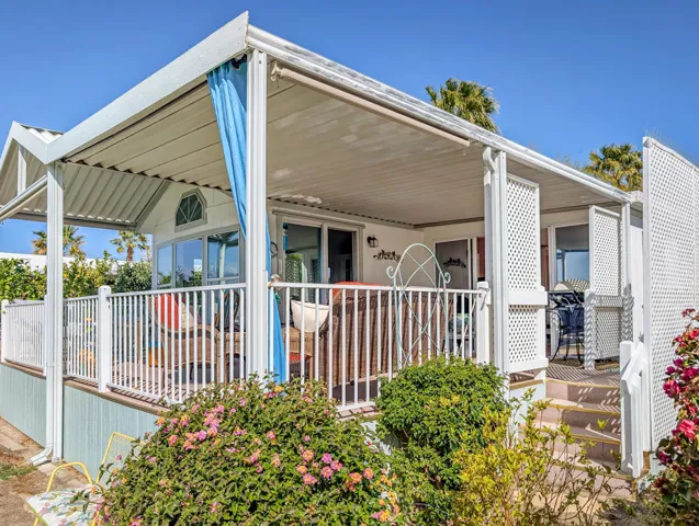 Situated high above the 9th hole on the golf course with views of Mt. San Jacinto, water features, and blue sky for miles this great 2000 Skyline Park Model awaits you! Here we have 1+ bedroom, 1 bath and many upgrades including new flooring, new carpet on back deck, king sized bedroom, 2nd sleeping area in California room equipped with a beautiful queen size murphy bed and the room has a door that closes off to main home for added privacy for guests. This well-appointed home is south facing and offers the most spectacular scenery from all around this unique place, here you can have a private and serene setting on the large, covered deck perfect for entertainment and on the inside of the home we have, a bright cheery decor and natural sunlight throughout make this an ideal getaway or permanent place to call home. Caliente Springs is a premier 55+ luxury resort with amenities that make you feel like a VIP, including a mineral-fed hot spring pool and spas, a 9-hole golf course, water ball, water aerobics classes, yoga, 8 pickleball courts, tennis courts, and much more in this lively and active community. The lot is not owned; space rent is $950. Comes with golf cart.