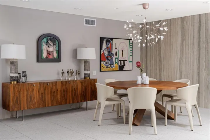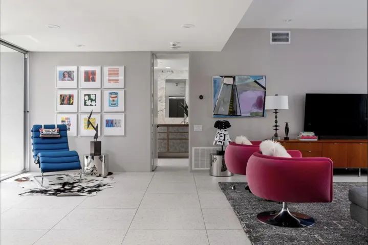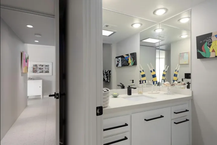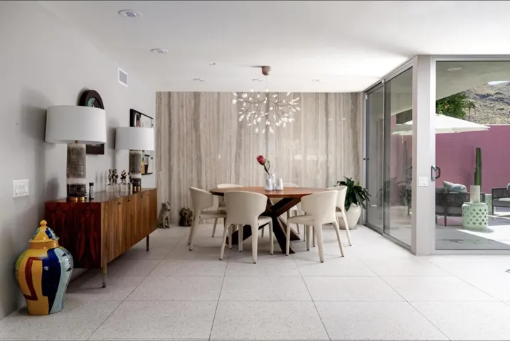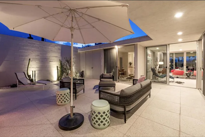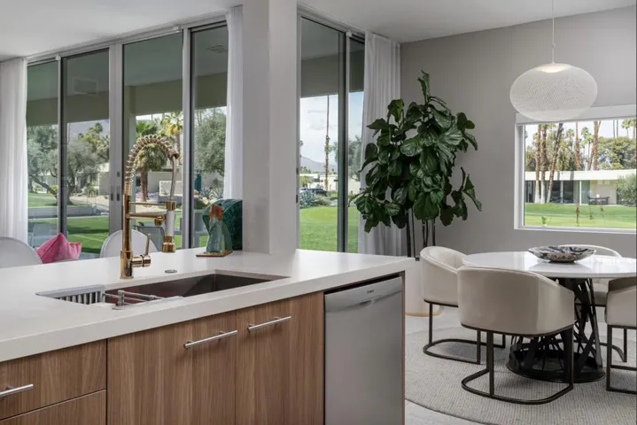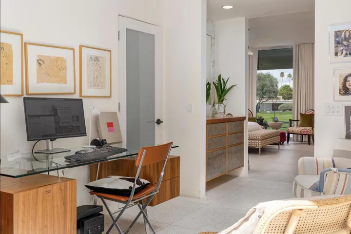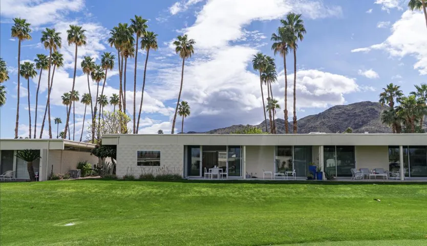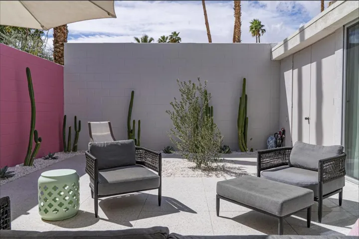 Elegance meets tranquility in this beautifully renovated 2-bedroom, 2-bath + den residence, designed by acclaimed mid-century architect Richard Harrison. Nestled on the 10th green with an ideal north/south orientation, this exceptional home offers both privacy and sweeping golf course views in the prestigious 7 Lakes Country Club. Meticulous upgrades include an updated electrical panel, HVAC system with a bonus mini split in the guest room, a tankless hot water heater and new energy efficient Fleetwood sliders throughout. The interior has been spaciously expanded in the living and dining area, along with the primary bedroom which includes a separate work from home space. A lovely private courtyard provides an idyllic space for relaxing, entertaining, or simply soaking in the serene desert landscape. Redone throughout with top-tier finishes, you’ll appreciate the carefully selected materials and attention to detail. A chef’s kitchen boasts high-end appliances, custom cabinetry, and sleek quartz countertops, making every culinary experience a delight. Both bedrooms offer generous closet space, built-ins, and tranquil views, ensuring comfort and privacy for residents and guests alike. A coveted garage is included for your convenience. Plus, your pool escape and clubhouse are just steps away. Past the 24-hour guarded gate, ‘The Gem of the Desert’ offers a unique elevated lifestyle with its Ted Robinson-designed 18-hole executive golf course, 15 pools and spas and lively William Cody designed clubhouse waiting to welcome you to its formal dining room, casual cocktail lounge and a terrace overlooking the famous Seven Lakes fountain. Welcome home!