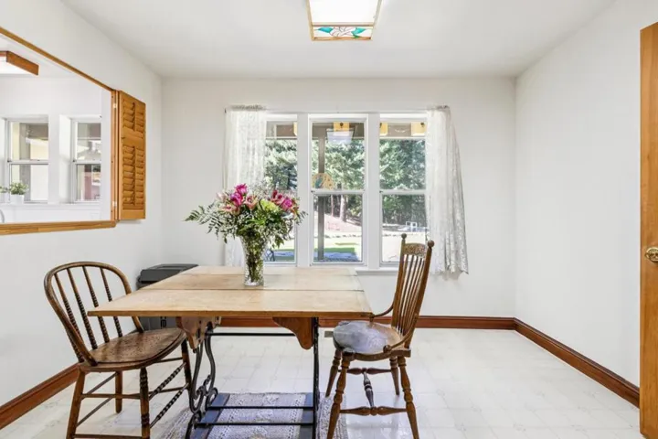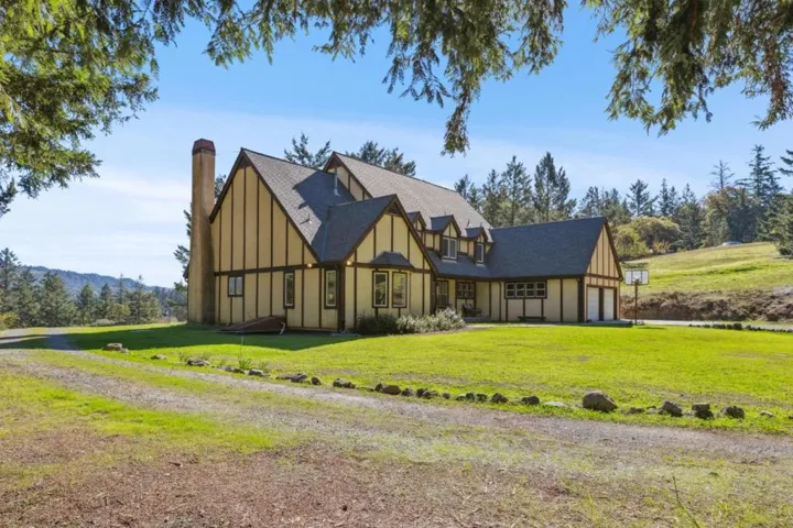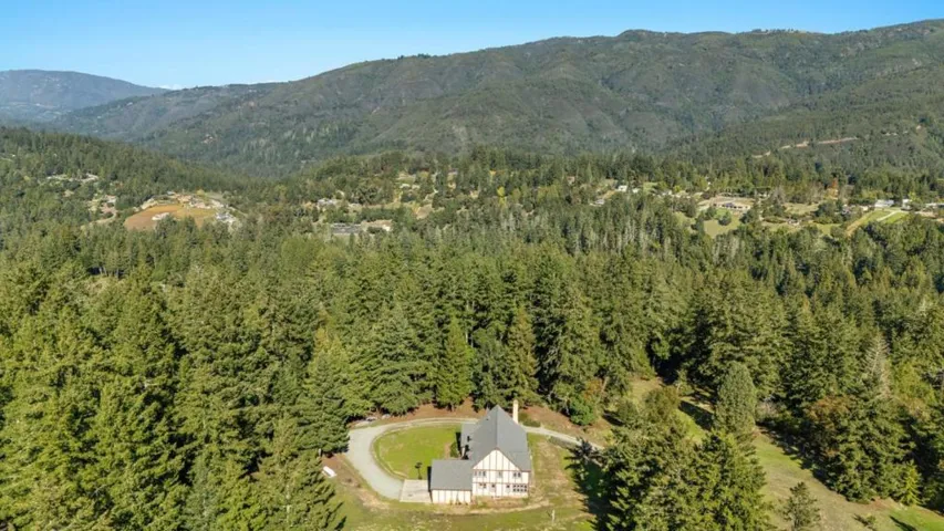 Tudor-style home built in 1993, set on over 24 acres of sunny rolling land, with serene mountain views. A long private driveway leads to the home and 2-car att. garage. Formal entry opens to the impressive formal living room with walls of windows and soaring ceilings. Kitchen, breakfast room, formal dining, sunroom, and library with custom built-ins and cozy wood-burning fireplace. Ground floor primary bedroom with walk-in closet, full bath with original copper claw-foot tub. Upstairs comprises 2nd primary with ensuite bath, 2 further bedrooms & hall bath. Rare full basement offers interesting expansion possibilities, eg. home theater, gym, bar, workshop. Outdoors – explore private trails through redwood, oak, fir & bay trees. Mature fruit trees include pear, apple, apricot, prune, avocado, orange, lemon, and peach, plus a 100-year-old Concord grape vine. Various historic outbuildings, including the original detached garage, storage barn, and bath house. Restore the iconic 100-year-old barn? Endless potential for future development – room for ADU, pool, sports court, organic farm, or vineyards and winery. The property is served by a private well & 2 springs. Rare opportunity only 20-25mins from Los Gatos & Capitola, close to Summit Store, wineries, & top-rated schools.