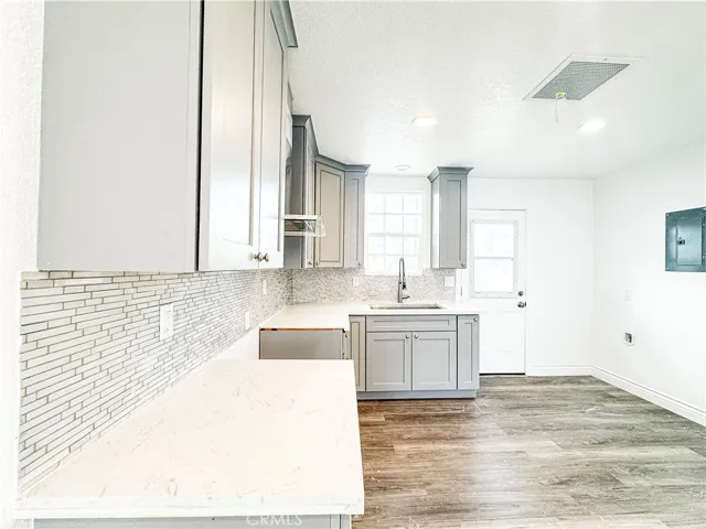 Newly remodeled 4-bedroom, 3-bathroom home in the heart of Corona, CA. This residence features a bright, modern kitchen with gray shaker cabinets, quartz countertops, tile backsplash, and recessed lighting. The flowing layout includes durable wood-style flooring throughout, fresh interior paint.