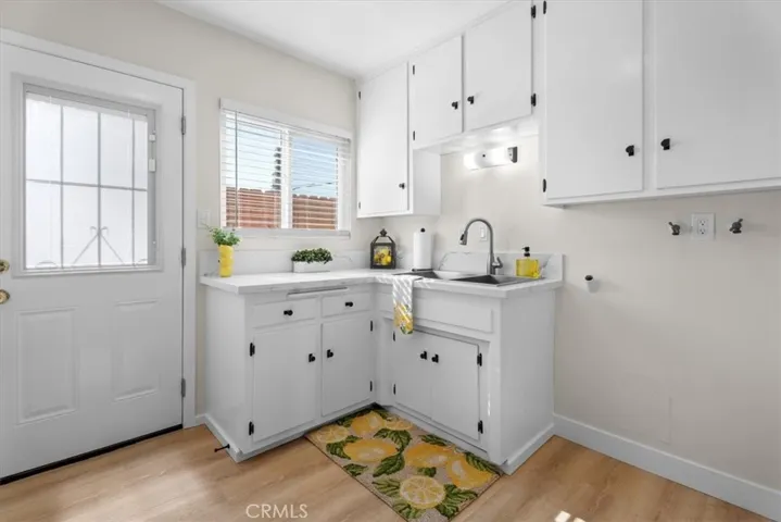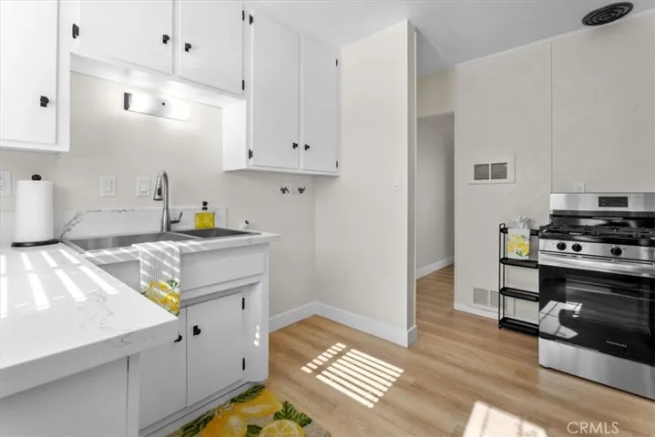 This beautifully updated, light-filled single-story home in Bellflower with two bedrooms and one bath is now available for lease. Recently remodeled, it features fresh paint, brand-new double-pane windows, sleek laminate vinyl flooring, and new baseboards. Each room is outfitted with modern light fixtures, new ceiling fans in the bedrooms, brand-new blinds, a new water heater, and stylish interior doors. The kitchen shines with freshly painted cabinets, a quartz countertop, and brand-new appliances, including a stove and refrigerator. The bathroom offers elegant tiled flooring and a shower-tub combo. Outside, a charming fenced backyard has a concrete patio perfect for grilling, and the exterior boasts fresh paint and beautiful new landscaping. Conveniently located just minutes from downtown Bellflower, schools, markets, restaurants, and more.