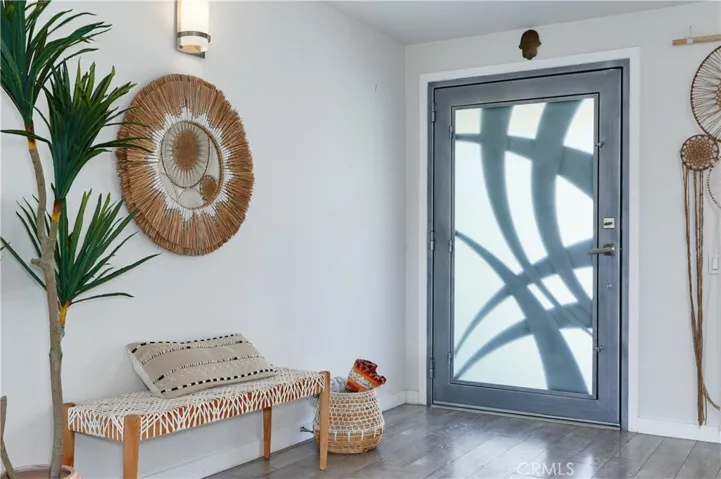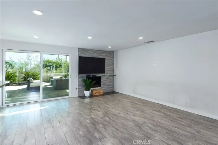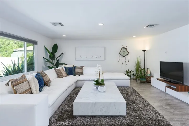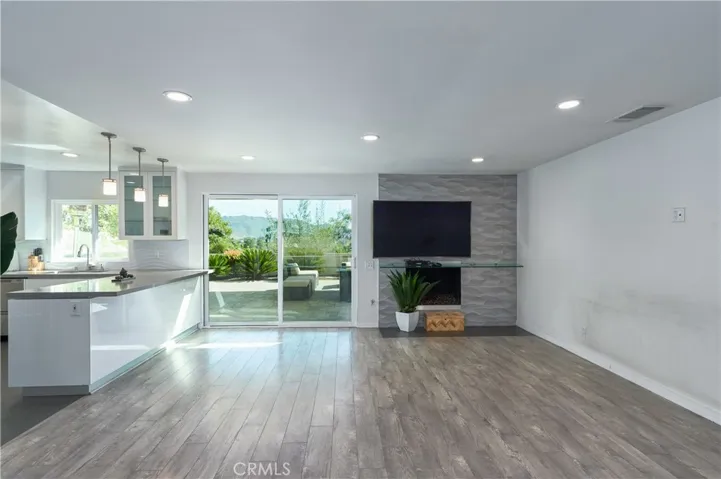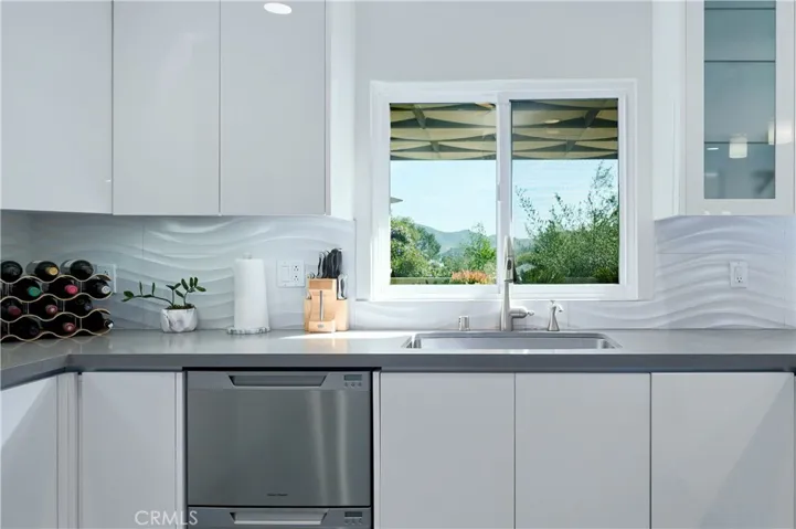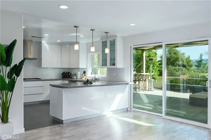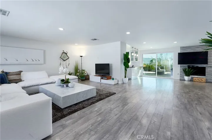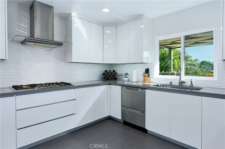 Inside, you’ll find smooth ceilings with recessed LED lighting, rounded drywall corners, and gray-toned wood-look laminate flooring throughout. The open floor plan highlights a modern kitchen with white high-gloss lacquer cabinetry, gray Caesarstone countertops, and top-tier stainless steel appliances including a built-in refrigerator with cheese drawer and bottom freezer, double ovens, dual dishwashers (small and large), and a gas range with hood.