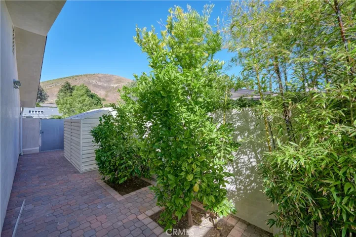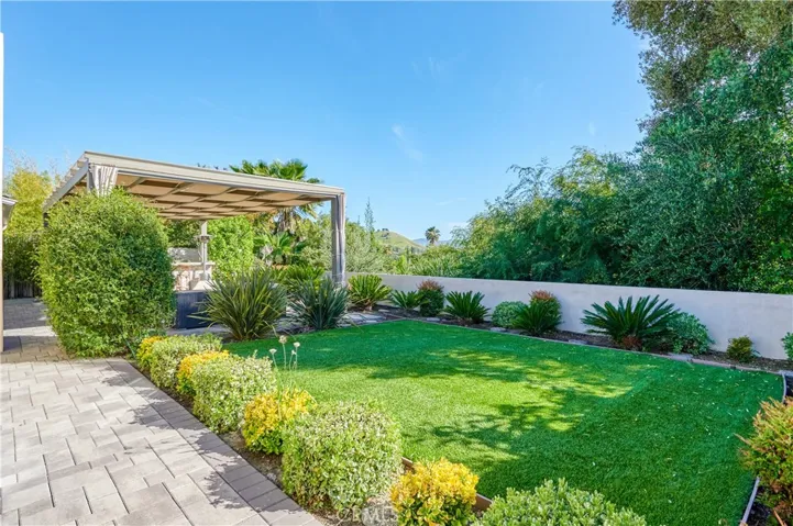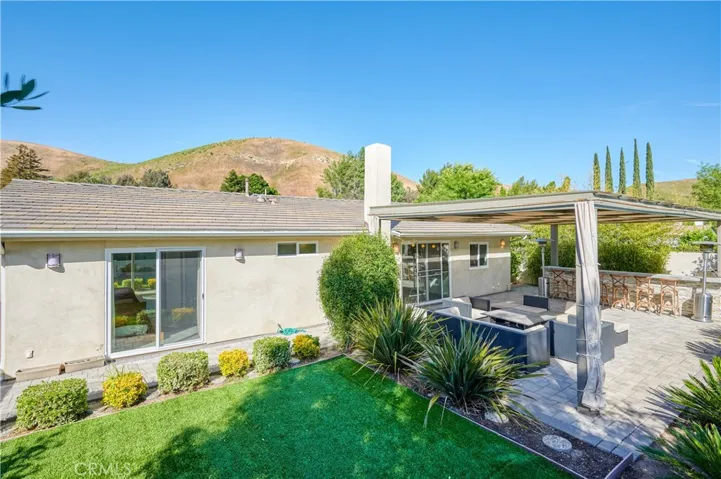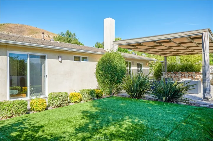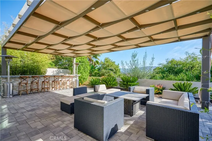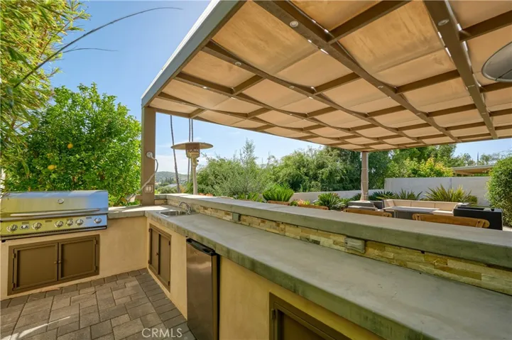 The backyard is built for entertaining, complete with a view, custom-designed detached shade structure with built-in LED lighting and curtains, and a built-in BBQ.