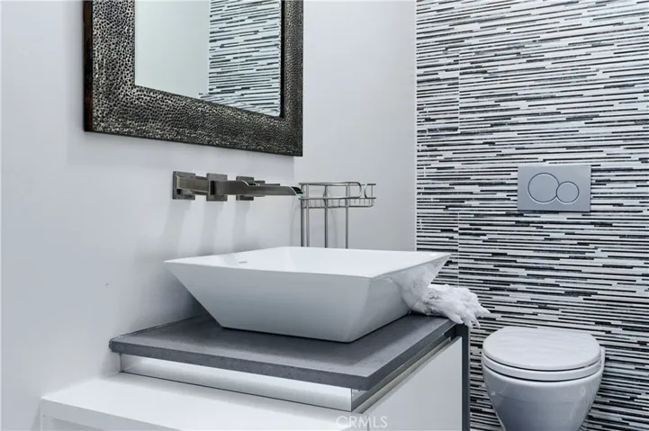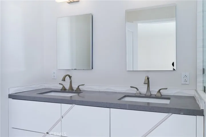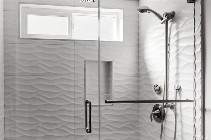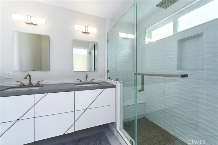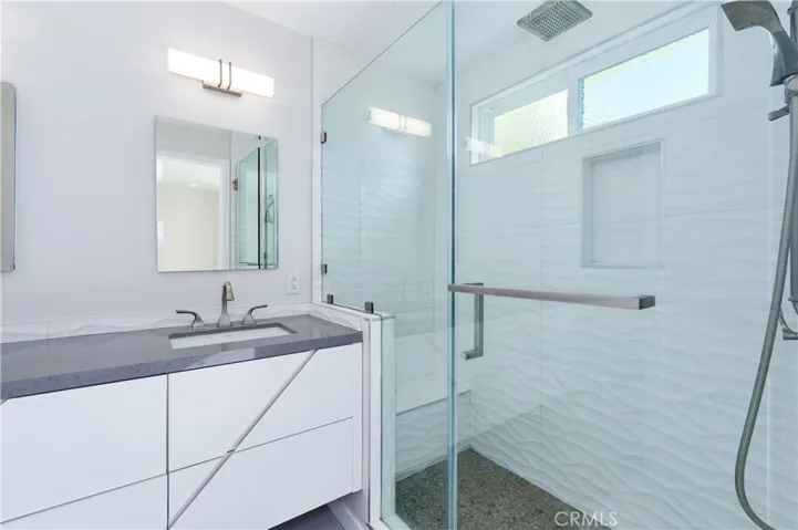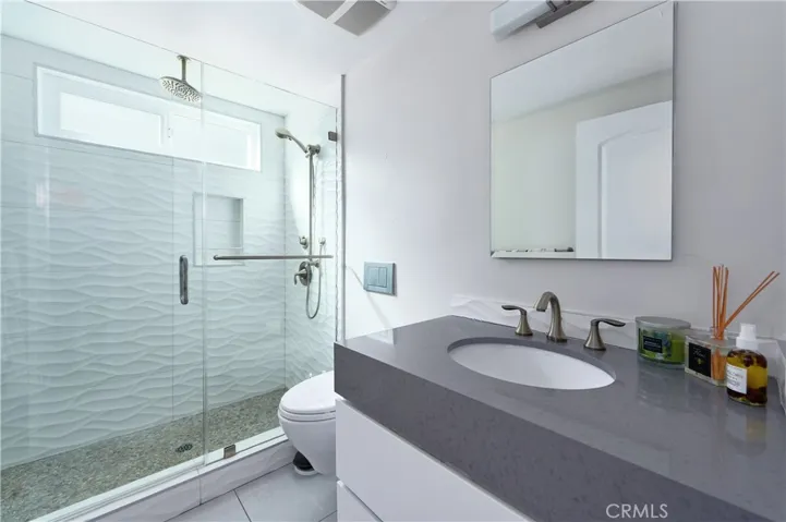 Both full bathrooms are thoughtfully upgraded with frameless glass shower enclosures, wall-hung dual-flush toilets, and contemporary tile flooring.