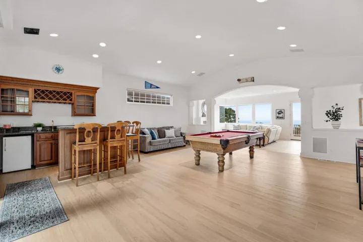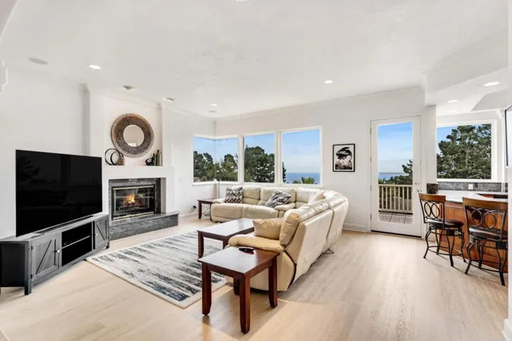 Experience coastal living in this beautifully designed living space across three levels. Enjoy breathtaking ocean views from the living room, kitchen, and primary suite. The spacious, fully equipped kitchen features panoramic windows and newly refinished wood cabinets. High ceilings, Venetian plaster walls, and oversized windows fill the home with natural light. The floor plan includes a formal dining room, living room, family room, game room with a pool table and bar, separate office, and main-level laundry. The primary suite boasts a private balcony, a walk-in closet, and a luxurious bathroom with a whirlpool tub, a shower/steam room. Relax by one of three fireplaces or take in the fresh air from two balconies. Outdoors, enjoy a front and back yard frequently visited by deer and rabbits. A 3-car garage with high ceilings provides ample storage. Fully furnished and move-in ready. The property is perfectly located just 10 10-minute drive to downtown Monterey with plenty of shopping, dining, and entertainment options, including Cannery Row and Monterey Bay Aquarium. The 17-mile drive is minutes away; plenty of hiking trails, parks, and beach walks. Furnished and move-in ready.