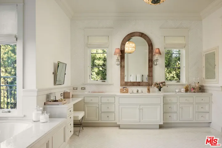 A timeless traditional estate gracefully sited on one of Holmby Hills’ most coveted streets. Behind private gates, this elegant residence blends classic architecture with interiors by New York based designer Markham Roberts. A dramatic two-story foyer sets the tone, leading to gracious formal rooms rich with detail, from the lacquered library and sophisticated billiards room to sunlit living spaces that open seamlessly to expansive grounds, a resort-style pool, and a tennis court. Thoughtful craftsmanship, custom millwork, marble thresholds, and designer lighting create a luxurious yet welcoming atmosphere throughout. Lush mature landscaping, a pool pavilion, and generous outdoor lounge and dining terraces provide a serene retreat for relaxation and entertaining. The primary suite is a private sanctuary unto itself, complete with an intimate office, safe room, dual spa-inspired baths, generous custom closets, and a beautifully integrated built-in bar/kitchenette. A backdrop of golden hills and twinkling city lights elevates everyday living. Additional amenities include a fitness studio spa, wine cellar, guest house, media room, elevator, ample bedrooms for staff and a 4-car garage. A rare offering of scale, privacy, and sophistication in one of Los Angeles’ most distinguished neighborhoods. Property available fully furnished for $55M. Approx. SF Breakdown: Main house 13,556 sf, Guest House 2,553 sf, Pool House 196 sf
