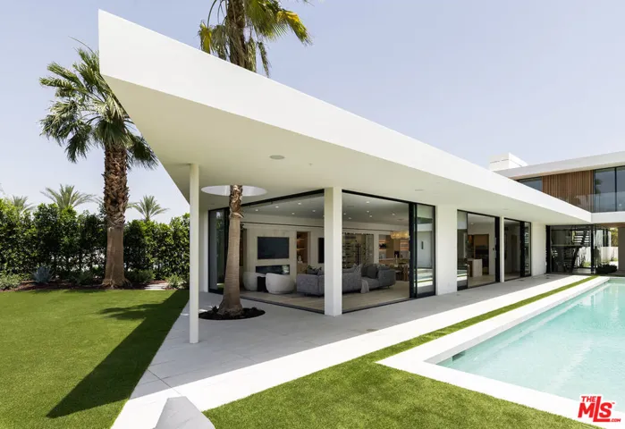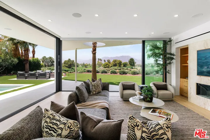 Stunning new architectural remodel with spectacular mountain views and a Palm Springs flair in the exclusive Madison Club. This home showcases walls of glass and a balanced mix of stone, wood, fire, and water features, and the finest finishes, including Wolf, Sub-Zero, and Miele appliances, as well as marble and quartzite throughout. The primary retreat encompasses the entire second floor, complete with bedroom, indoor/outdoor office, large bathroom with laundry room, covered rooftop deck, and elevator. There are two guest rooms on the main level of the home. Additional amenities include a theater, temperature-controlled wine room, wet bar, and butler’s pantry. A very spacious two-bedroom, two-bath casita with living room and kitchen will accommodate your guests in style. The home opens to panoramic views of the golf course and mountains, a sparkling pool with raised spa, and BBQ island, perfect for year-round outdoor entertaining.