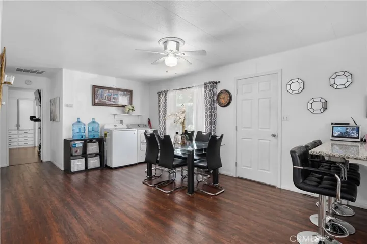Inside, the main living area features laminate flooring and a wonderfully open layout. The large family room flows into the dining room, which includes built-in cabinetry for added storage and display. The kitchen is bright and inviting, equipped with granite countertops, tile backsplash, and a cozy breakfast nook with washer/dryer hookups nearby for convenience.