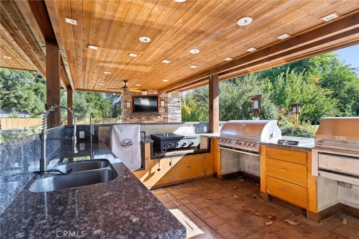 Every day feels like a getaway in this stunning custom home. A rare blend of luxury, comfort, and entertainment all in one. With 4 spacious bedrooms, 2.5 bathrooms, and over 3,100 sq. ft. of beautifully designed living space, this property is truly one of a kind. Step inside to a grand, open kitchen featuring upgraded countertops, newer stainless-steel appliances, and abundant custom cabinetry. The oversized island flows seamlessly into the living area, perfect for family gatherings or hosting friends. The living room impresses with its cozy pellet stove and a fully equipped custom bar, complete with granite countertops, custom lighting, a full-size refrigerator, a wine fridge, a sink, and six taps. An entertainer’s dream! Each bedroom offers generous space and comfort, while the primary suite feels like a five-star retreat. Enjoy a walk-in closet, dual vanities, a private wet bar with a wine fridge, an oversized walk-in shower with multiple showerheads (including a rainfall showerhead), and a two-person jetted tub, ideal for unwinding at the end of the day. Step outside and discover an outdoor oasis designed for year-round enjoyment. The tri-level patio boasts a complete outdoor kitchen, multiple seating areas, a large bar, ceiling fans, a mounted TV, a built-in sink, BBQs, a smoker, and ample under-counter storage. At the center is a resort-style swimming pond with a beach entry, natural granite slabs, and a stunning waterfall feature, surrounded by mature landscaping and fruit trees that create your own private paradise. Additional features include a 30′ x 40′ powered shop with lighting, built-in air lines, and plenty of space for projects or hobbies. The backyard also offers an amphitheater-style lawn with a full outdoor theater system, complete with a high-definition projector and surround sound, perfect for movie nights under the stars. For those who love sustainable living, the property includes raised garden beds, a large chicken coop, and an impressive collection of fruit trees—peach, apricot, cherry, plum, pluot, orange, grapefruit, lemon, lime, fig, and pomegranate. Located just outside Chico city limits on 1.5 private acres, this home includes its own well, leased propane tank, and a semi-owned solar system. Welcome home to your very own private resort!