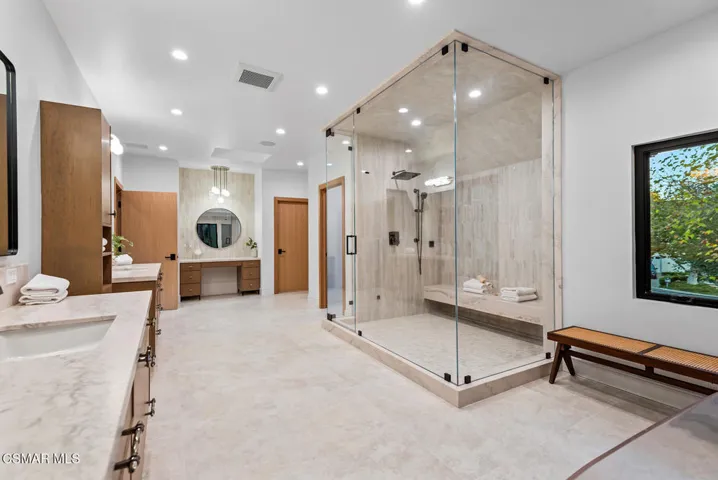 North Ranch masterpiece! Completely rebuilt and reimagined modern traditional with the ultimate ‘end of cul-de-sac’ location in the heart of North Ranch! Spanning approximately 7300 square feet with every amenity desired! Professionally designed and masterfully built using the very finest finishes throughout! Interior Features include an all new center island kitchen which boasts state of the art custom cabinetry, quartzite counters and top of the line appliances. The wide open floorplan is graced with massive two story custom ceilings, wood floors, floor to ceiling stone fireplaces and much more. The awe inspiring ‘great room’ is second to none and provides a walk in wet bar and wine cellar. Upstairs there is an awesome bonus area/lounge, 3 large secondary en-suite bedrooms and an exceptional primary suite that will leave you speechless. The primary suite is graced with custom wood detailed ceilings, fireplace, two finished walk in closets and a Four Seasons quality bathroom. There is also a large 5th en-suite bedroom on the main level. The resort quality grounds are second to none with an epic SELF CONTAINED guest apartment with separate entrance. The completely private backyard also provides a remodeled pool and spa, firepit, all new outdoor kitchen and an abundance of manicured lawns. Other amenities include new doors and windows, new HVAC and too much more to mention. This is a rare offering for an extraordinary ‘like new’ estate with the perfect location and setting!!