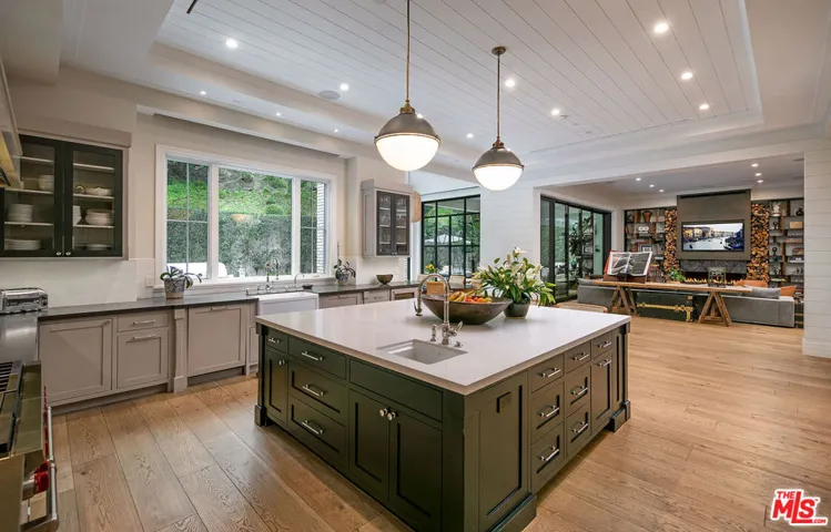 Modern Farmhouse with a twist. Prime Mandeville Canyon, built in 2018 with soaring scale and incredible detail. Approx. 10,600sqft open floor plan. Entry hall opens to formal living room, dining room and library with paneled walls and ceilings. Gourmet kitchen adjacent to amazing secondary living room that spills out to grounds and pool. Primary suite is a world apart with a sensational bath and dual closets. 5 secondary bedrooms are all large with ensuite baths. Lower level with bar, game room, wine cellar and screening room. Exceptional quality and move-in ready. Shown only to prequalified buyers.